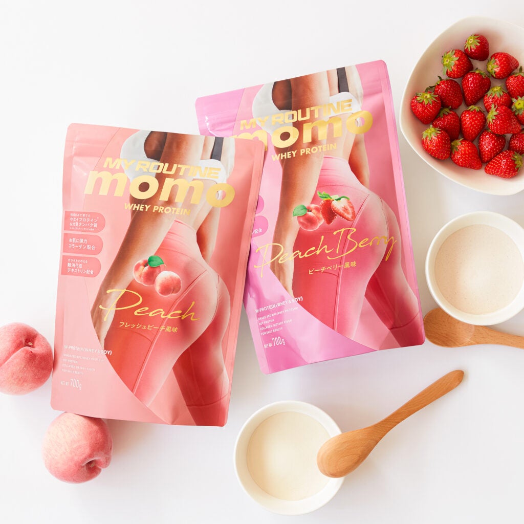(左から)マイルーティーン MOMOフレッシュピーチ風味・マイルーティーン MOMOピーチベリー風味