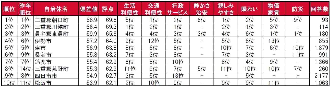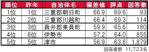 1位と2位は三重郡に属する朝日町と川越町、3位は員弁郡東員町で、トップ3は昨年に引き続き郡部に属する「町」という結果になっています。