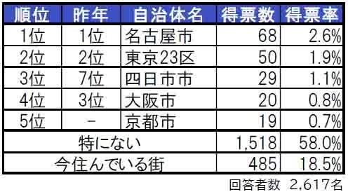 住みたい街1位は3年連続で名古屋市、2位東京23区。3位四日市市。