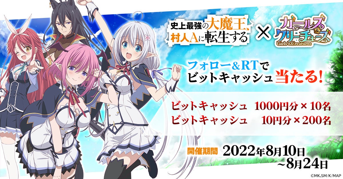 CTW株式会社は、ゲームサービスG123にて配信中のHTML5ゲーム『ガールズ&クリーチャーズ』において、TVアニメ『史上最強の大魔王、村人Aに転生する』とのコラボイベントを開始したことをお知らせいたします。