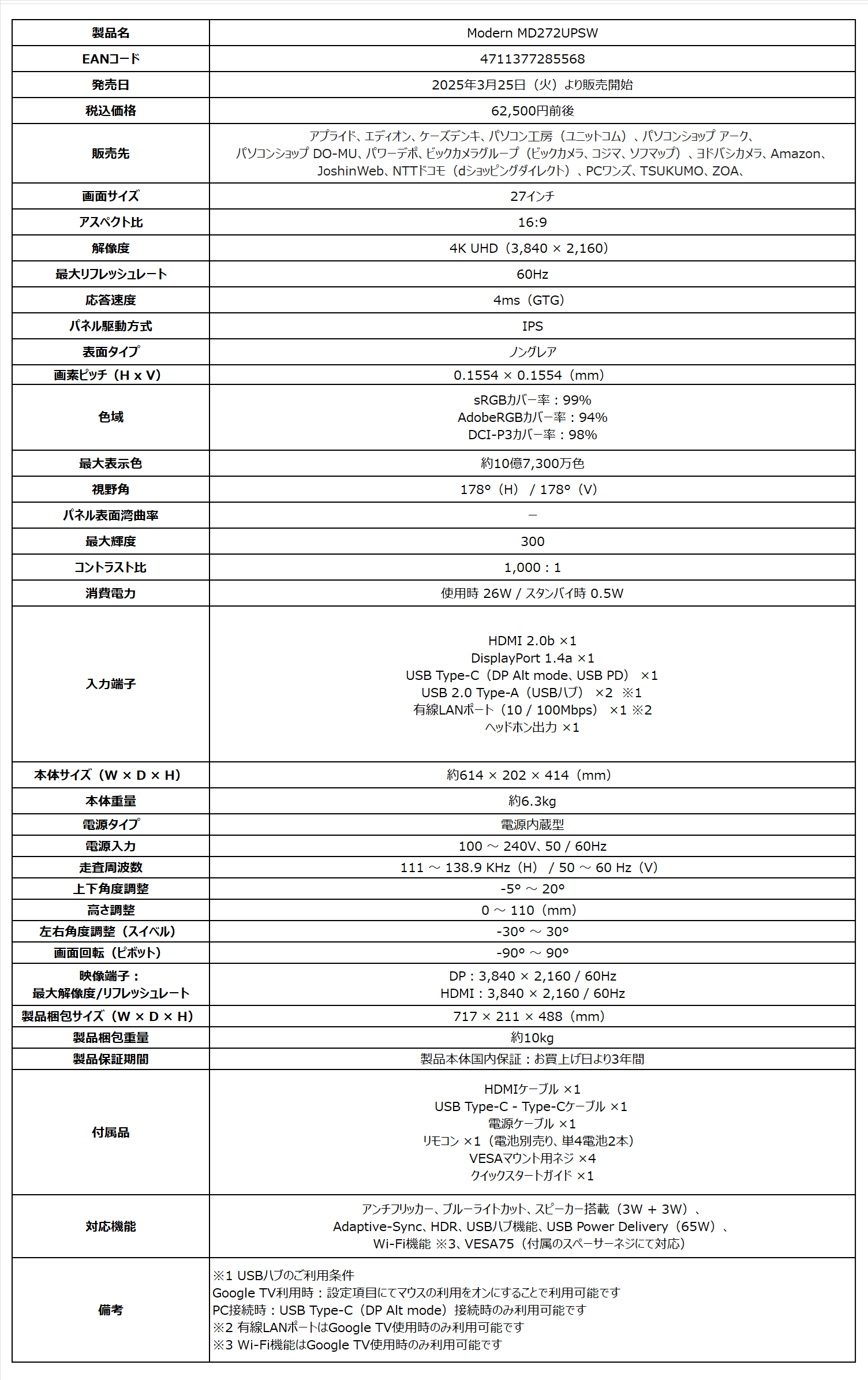 この度、エムエスアイコンピュータージャパン株式会社は、2025年3月25日(火)よりビジネス向けモニターブランド『Modern』シリーズの新モデルを発売いたします。4K解像度の高画質IPSパネルに、Google TV™ を搭載し、各種ストリーミングサービスやスマートフォンの画面をミラーリングして楽しめるほか、USB Type-C PD65W給電にも対応し、ビジネス・プライベートに最適な「Modern MD272UPSW」が新たにラインナップに加わります。