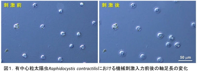 太陽虫と呼ばれる一群の原生生物(真核生物)は、細胞体表面から軸足と呼ばれる仮足を放射状に伸ばし(その名の由来)、各々の仮足は細胞骨格としてチューブリン分子から構成される微小管を内包しています。太陽虫は仮足の長さ(微小管の重合・脱重合)を調節し多様な細胞運動を行います。