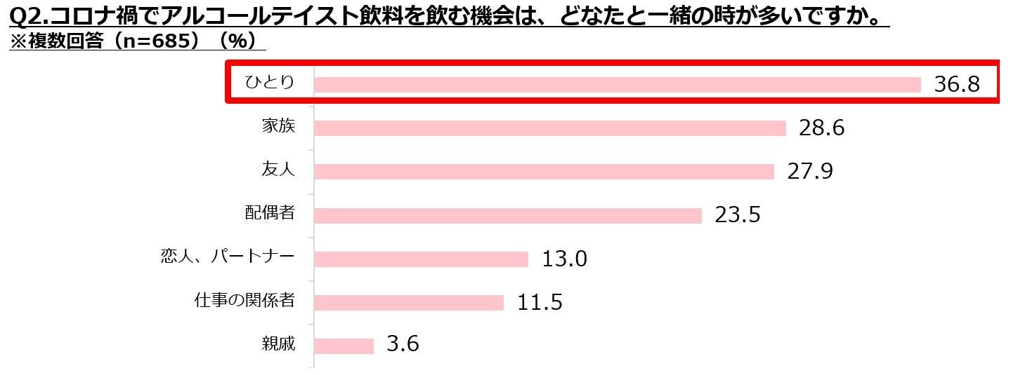 ・飲む相手は「ひとり」が3割台で最多で、次いで「家族」「友人」「配偶者」が2割台。