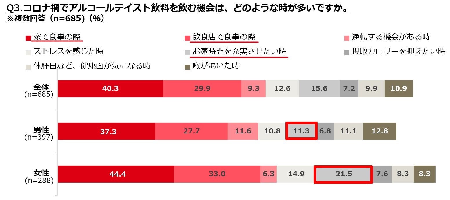 ・飲む機会は「家での食事」が4割、「飲食店での食事」が3割。