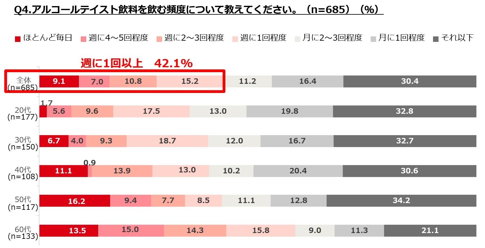 ・週に1回以上飲む人が4割強で、年代が上がるほど頻度も増加傾向。