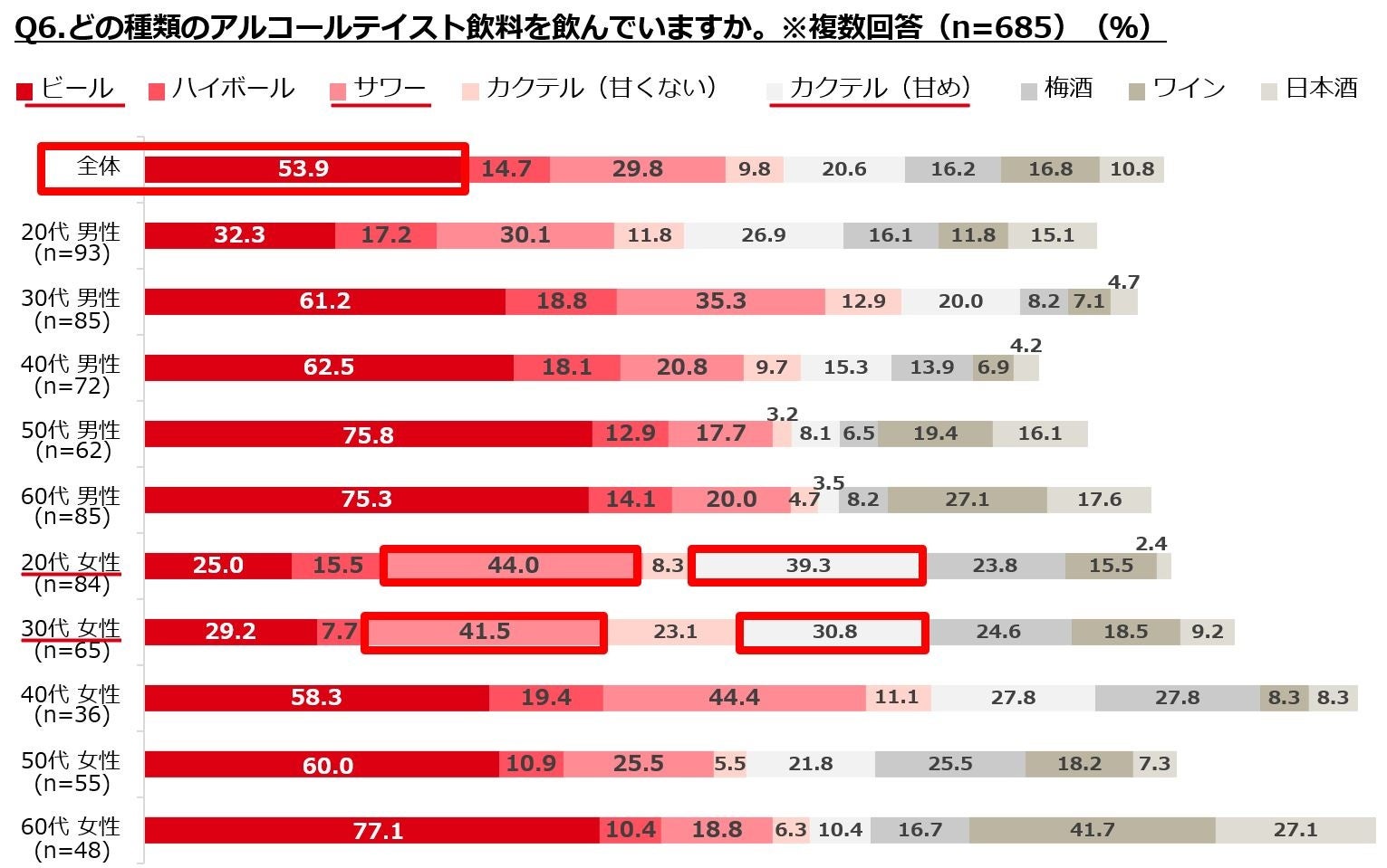 ・種類は「ビール」が最多だが、20~30代女性では「サワー」や「カクテル(甘め)」が上回る。