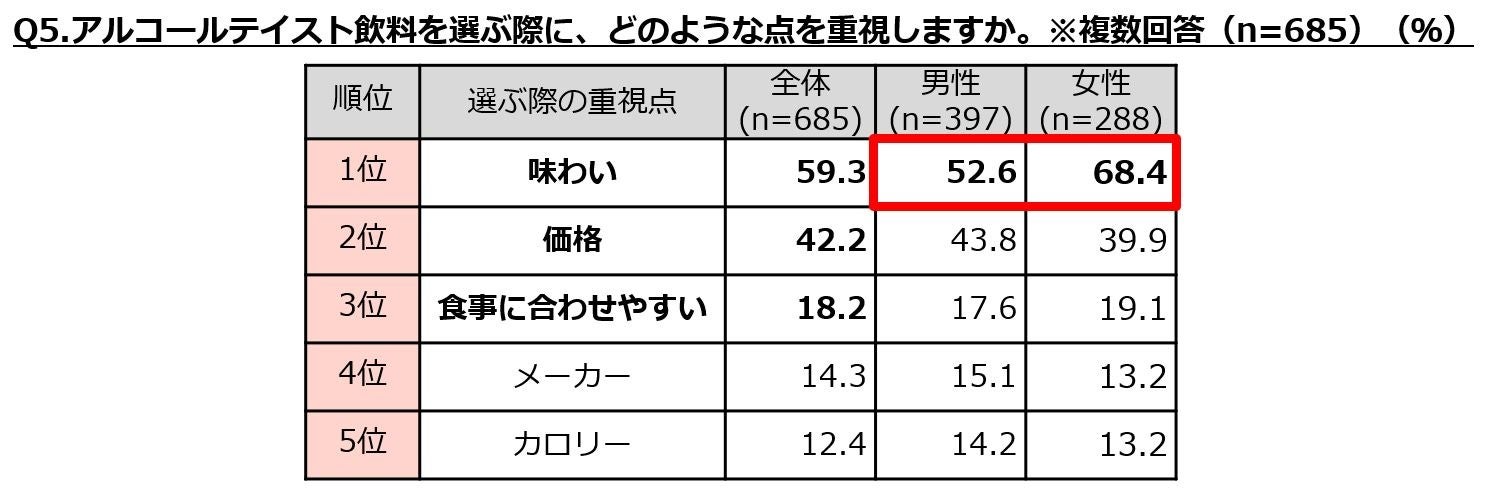 ・重視点は「味わい」が6割で最多だが、男女で約16ポイントの開きあり。