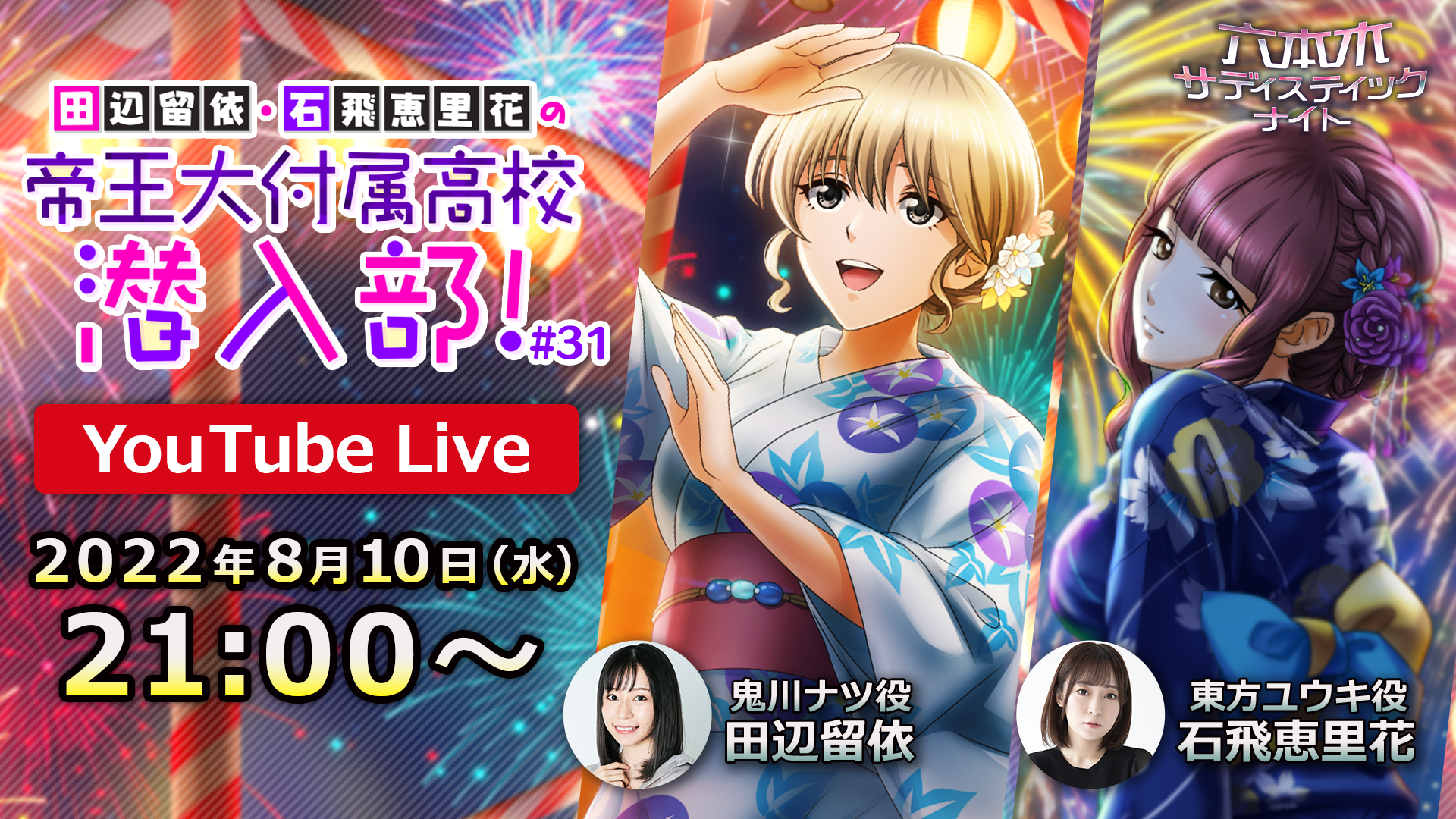 ゲームアプリ「六本木サディスティックナイト」公式YouTube番組 田辺留依・石飛恵里花の帝王大附属高校潜入部!#31 8月10日(水)21:00より生配信決定!浴衣でお届けするSP回