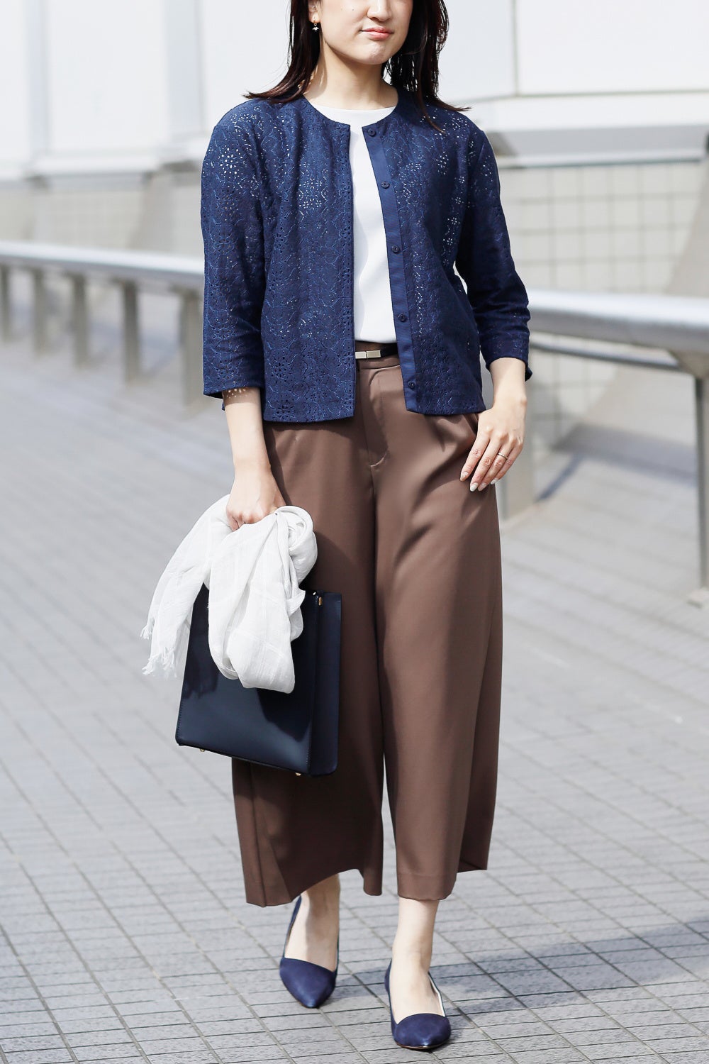 風通しの良いレースの羽織りは、ネイビーを選べばジャケット見え。ワイドパンツなどボリュームのあるボトムとも相性の良い、ややコンパクトな丈感です。ボトムにはあえてブラウンを選べばちょっぴり旬な印象に。濃色コーデには、インナーやストールで淡いカラーをプラスして軽さを出して。