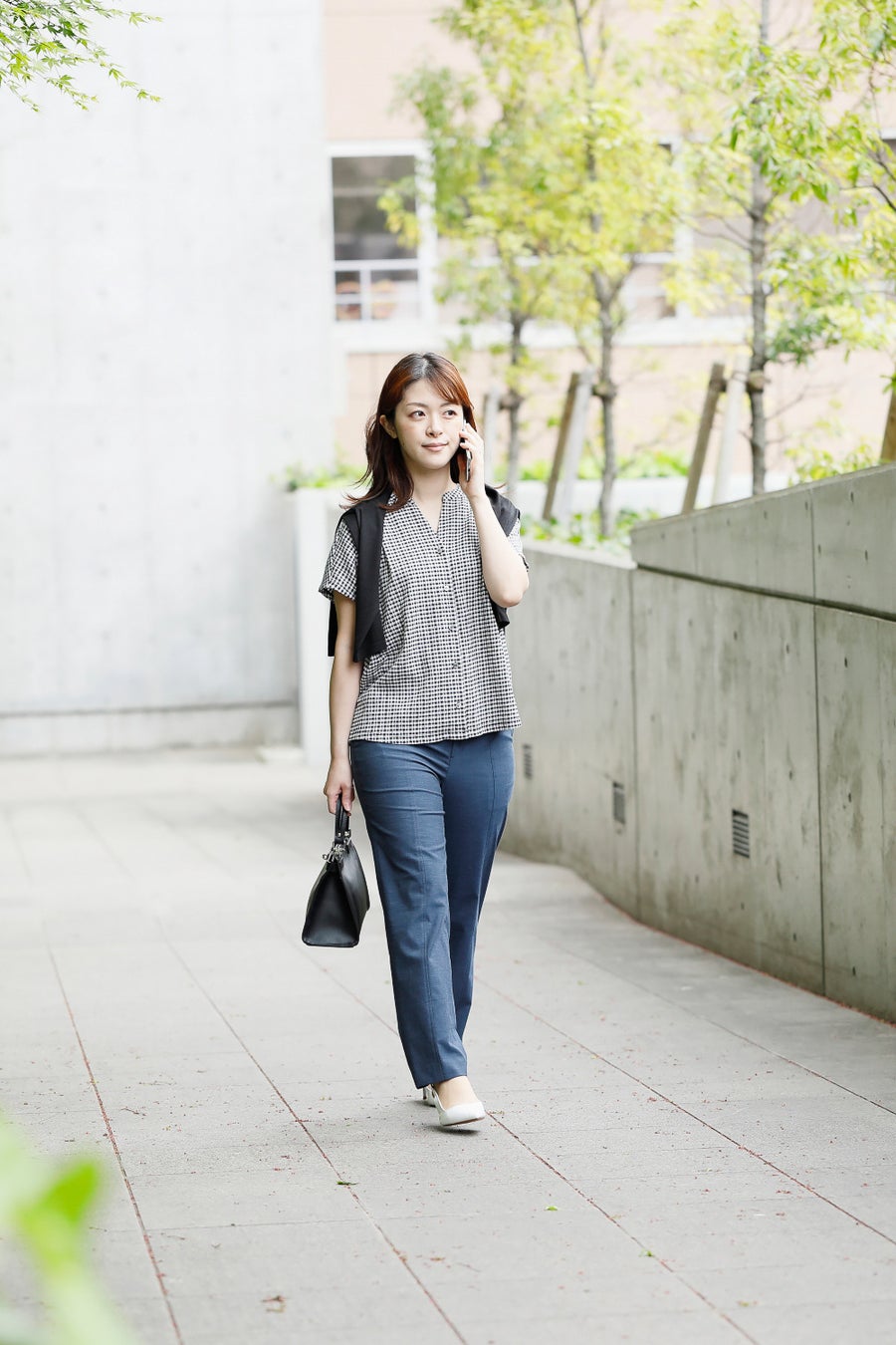 春夏に心惹かれるギンガムチェックが主役のコーデ。トップスはインナーの透けが目立ちにくく、表面に凹凸がありドライタッチな着心地で夏にぴったり。オフィスシーンに馴染ませるなら、落ち着いたカラーを合わせるのがポイント。ボトムはネイビーではなく、ブルーを選ぶと地味になりすぎず程よく着映えします。シルバーの金具が効いたバッグも、さり気ないアクセントに。