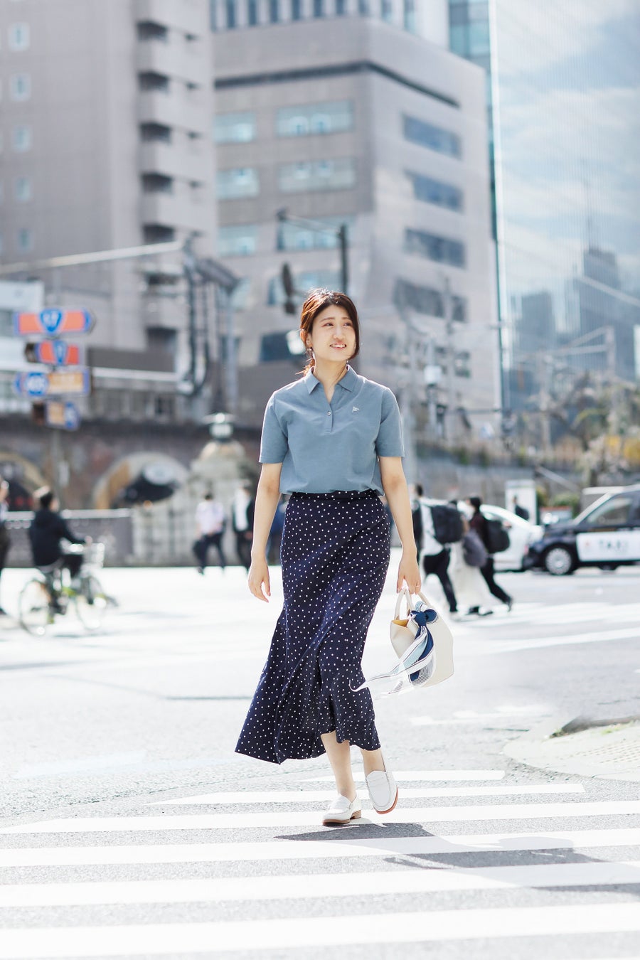 トラッドスタイルの定番であるポロシャツ。スポーティさを抑えて品よく着るなら、光沢感のある柄スカート合わせがおすすめ。ひざ下丈の長めスカートなら脚の露出が控えめに、歩き姿もエレガントな印象です。今年のモデルはスキッパーカラーに、胸元のフラッグ刺繍がポイント。