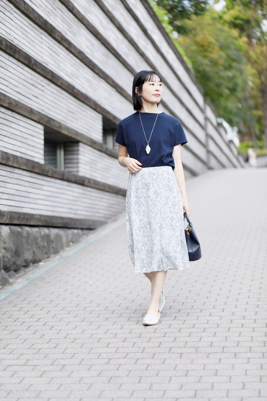 まずは、ネイビーのトップスを合わせたスカートスタイルのご紹介。程よいボトルネックで胸元の開きも気にならず、品よくお召しいただけます。ボトムには繊細なタッチで描かれた、夏の花柄スカートを選んで爽やかさをUP。寂しく見えがちな上下ワンツーコーデには、シェルを使ったペンダントで上品なきらめきをプラスして。