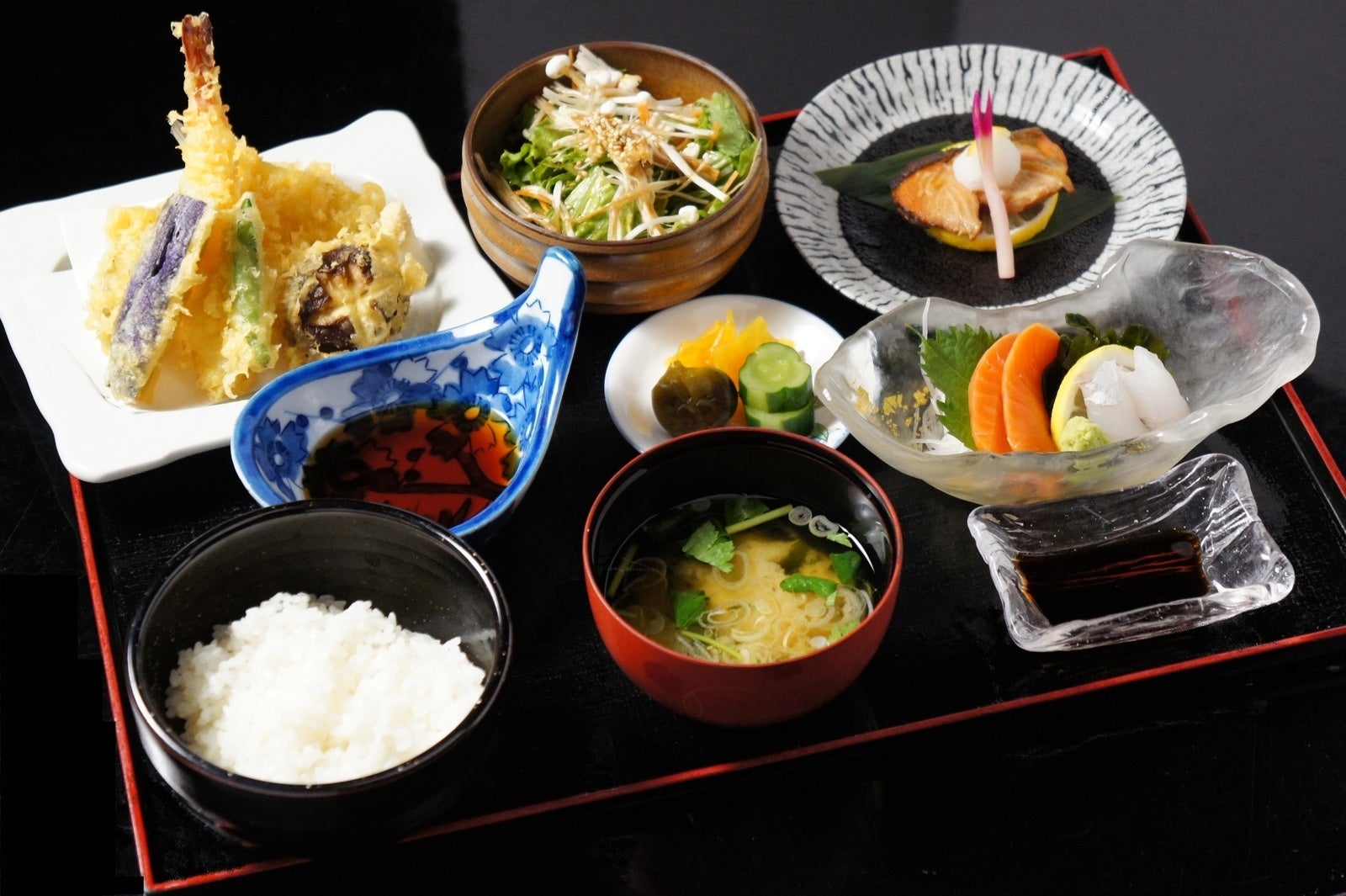メニュー:焼き物 / 天ぷら / お刺身 / ごはん ※おうどんに変更可能