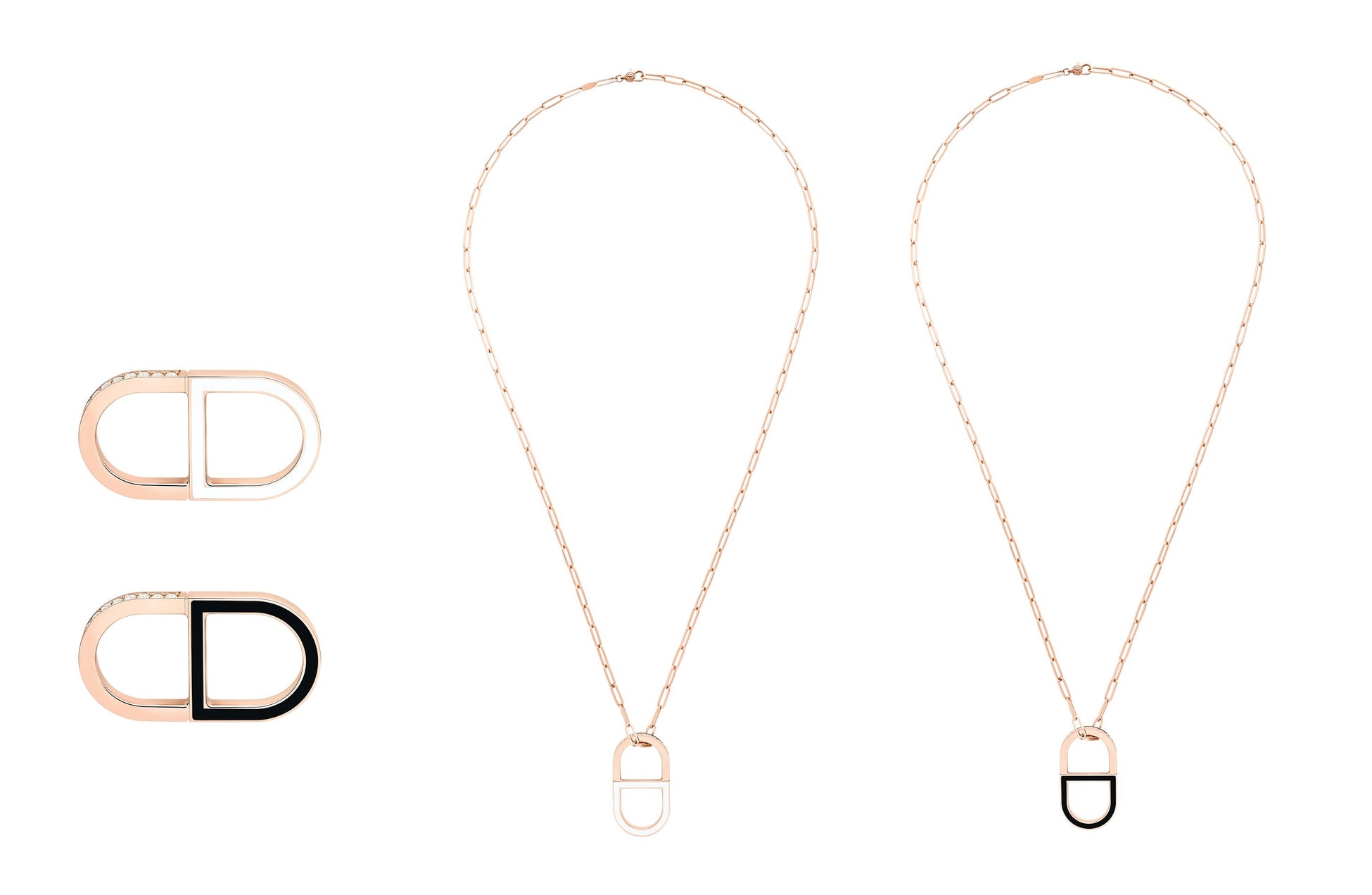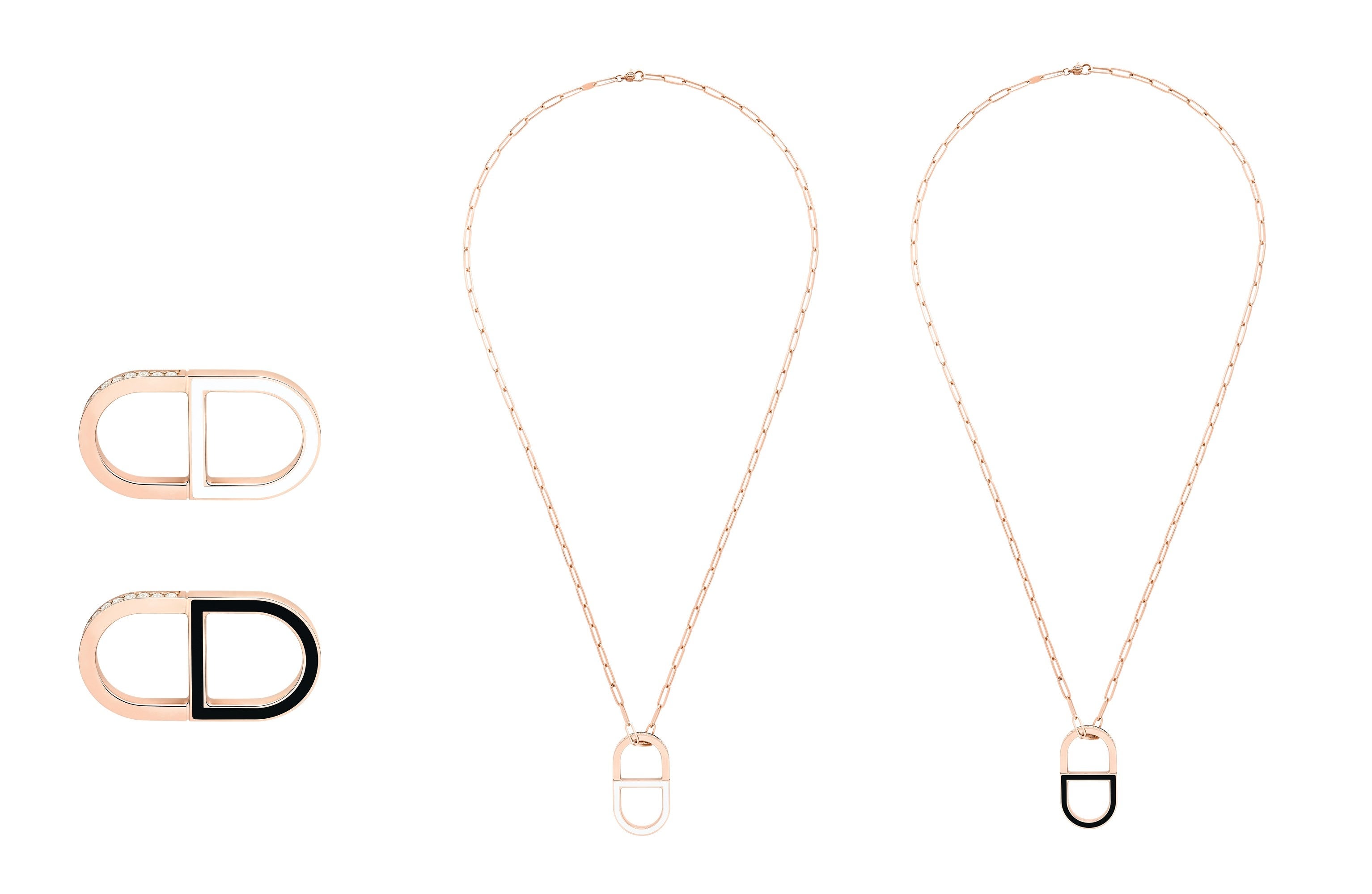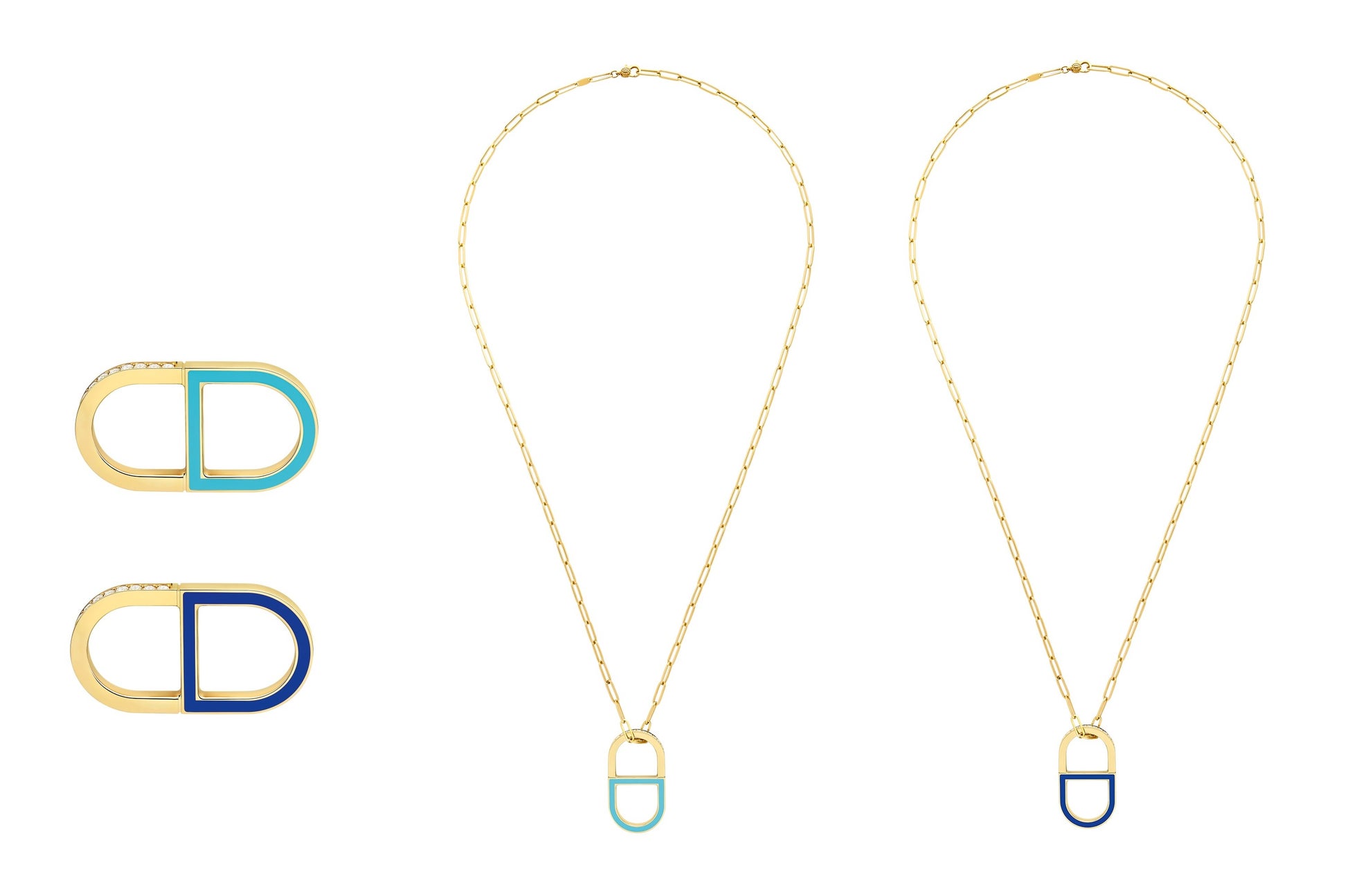 2023年6月、新たに登場するのは、イエローゴールドにターコイズとブルーラッカー、ピンクゴールドにホワイトラッカーとブラックラッカーを両表面で組み合わせたダブルリングとネックレスの2 wayジュエリーです。付属でセットされるゴールドチェーンはお好みの位置で留められ、自由な長さ調整が実現します。