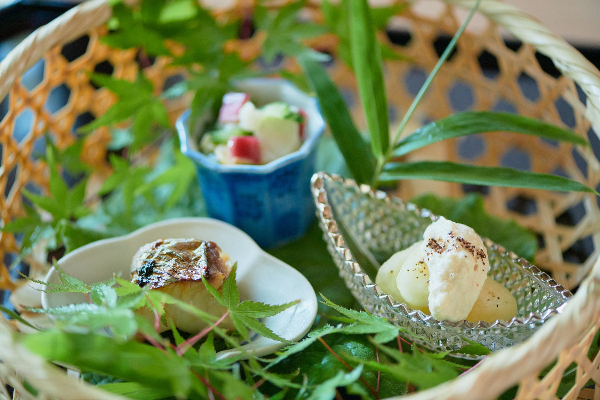 【夕食】ミシュラン1つ星を獲得された東京・南青山にある日本料理店「てのしま」の林亮平シェフが監修。地元の旬の食材を、セレクトされたお酒と一緒に。お食事処でご提供する季節を感じる、洗礼された日本料理のコースです。これに「ひなたの杜」湯川氏の猪を用いたステーキ一皿、また大阪・天満のワインショップ「salvis」代表 野口氏による、この日のためのワインペアリングが加わります。