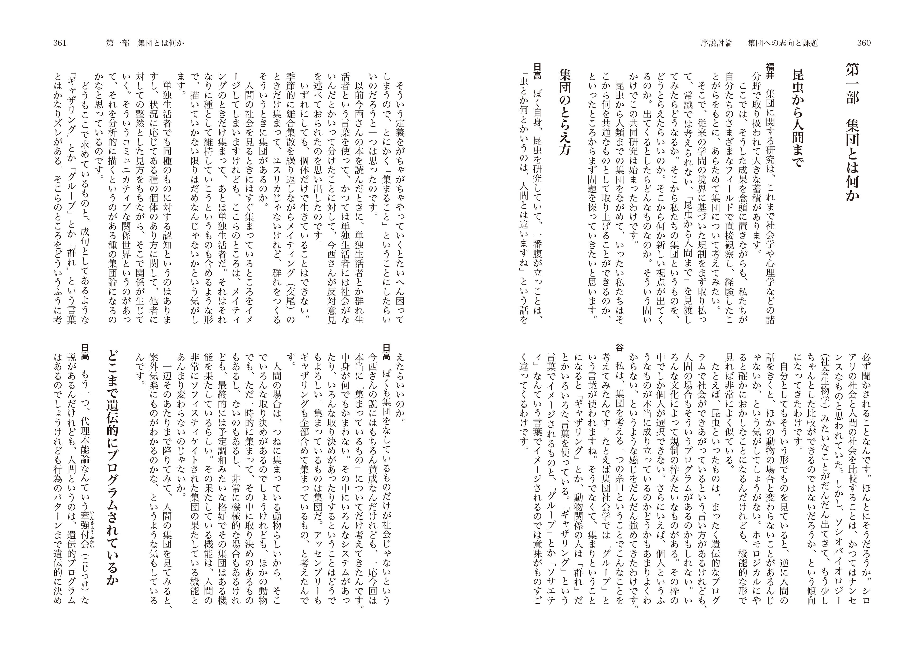 本書は、「なぜ人間は集団を作るのか」などをテーマに、人間の「集合と集団」の原理を探りながら、個と社会とその関係に迫る論考と議論の貴重な記録であり、現代の人間社会に斬新な問いと答えを投げかける比類なき研究をまとめた大著です。