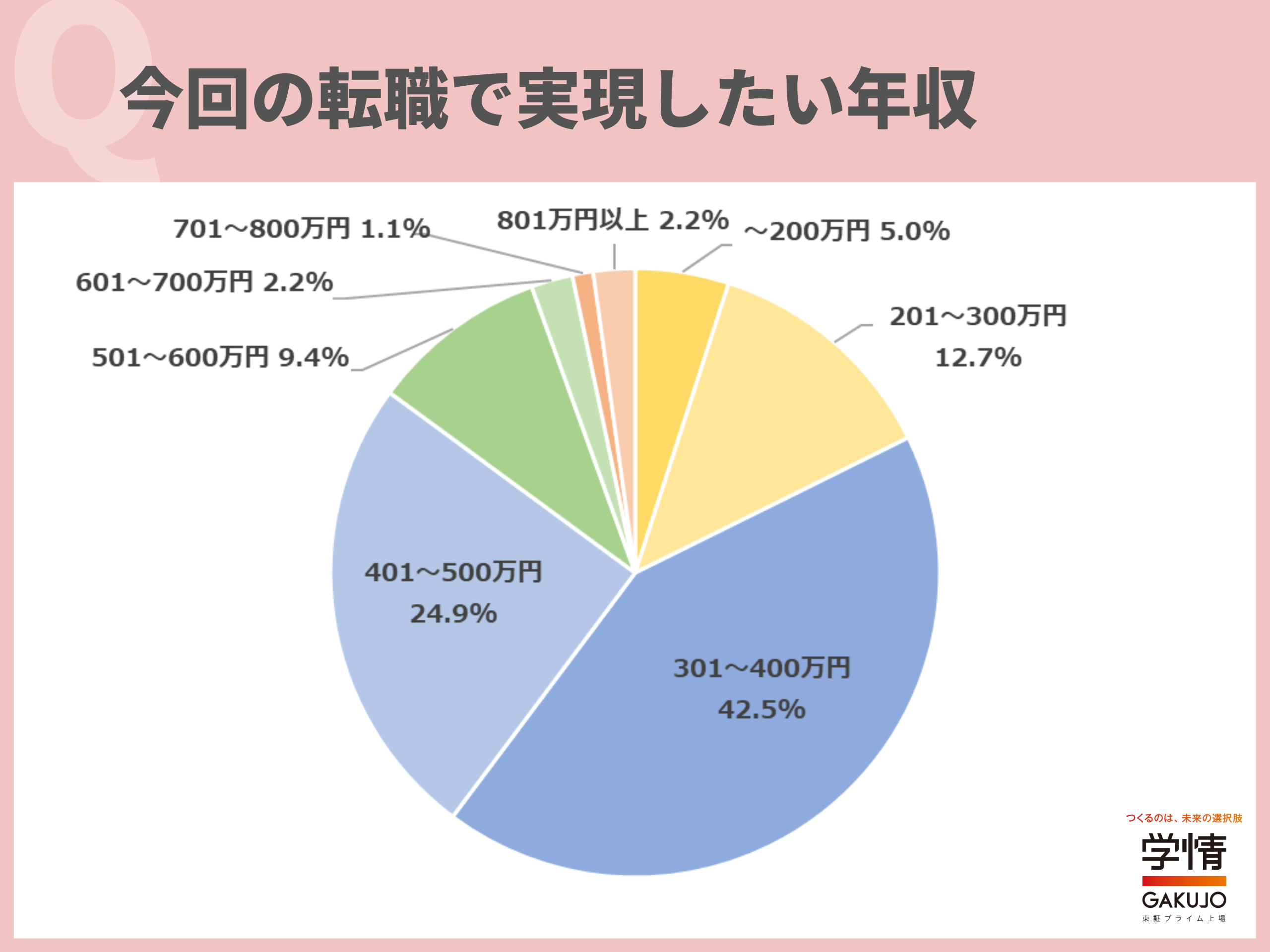 今回の転職で実現したい年収は、「301~400万円」が42.5%で最多。次いで「401~500万円」24.9%が続きます。「今の年収より上げたい」「現職と比較して、数十万円の年収アップを希望している」「現在の年収と同等か、50万円ほどアップの求人を探したい」といった声が上がりました。