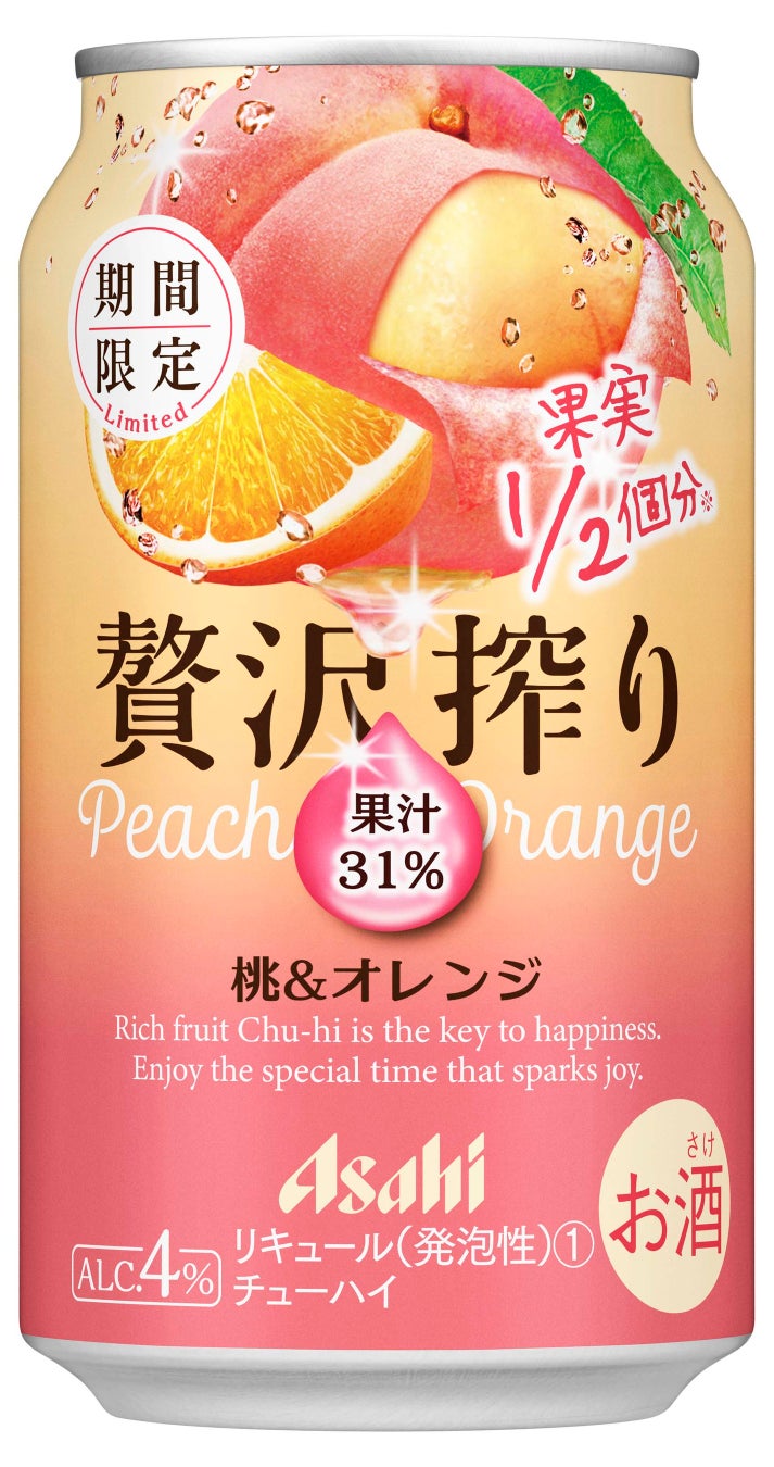 『アサヒ贅沢搾り期間限定桃&オレンジ』は、桃1/2個分※2にあたる果汁31%を使用しています。オレンジリキュールを加えることで、桃の芳醇な甘みとオレンジの酸味が混ざり合ったバランスの良い味わいが楽しめます。パッケージは、桃とオレンジのイラストを大きく描くとともに、ピンクとオレンジのグラデーションの背景で味わいの特長を表現しています。