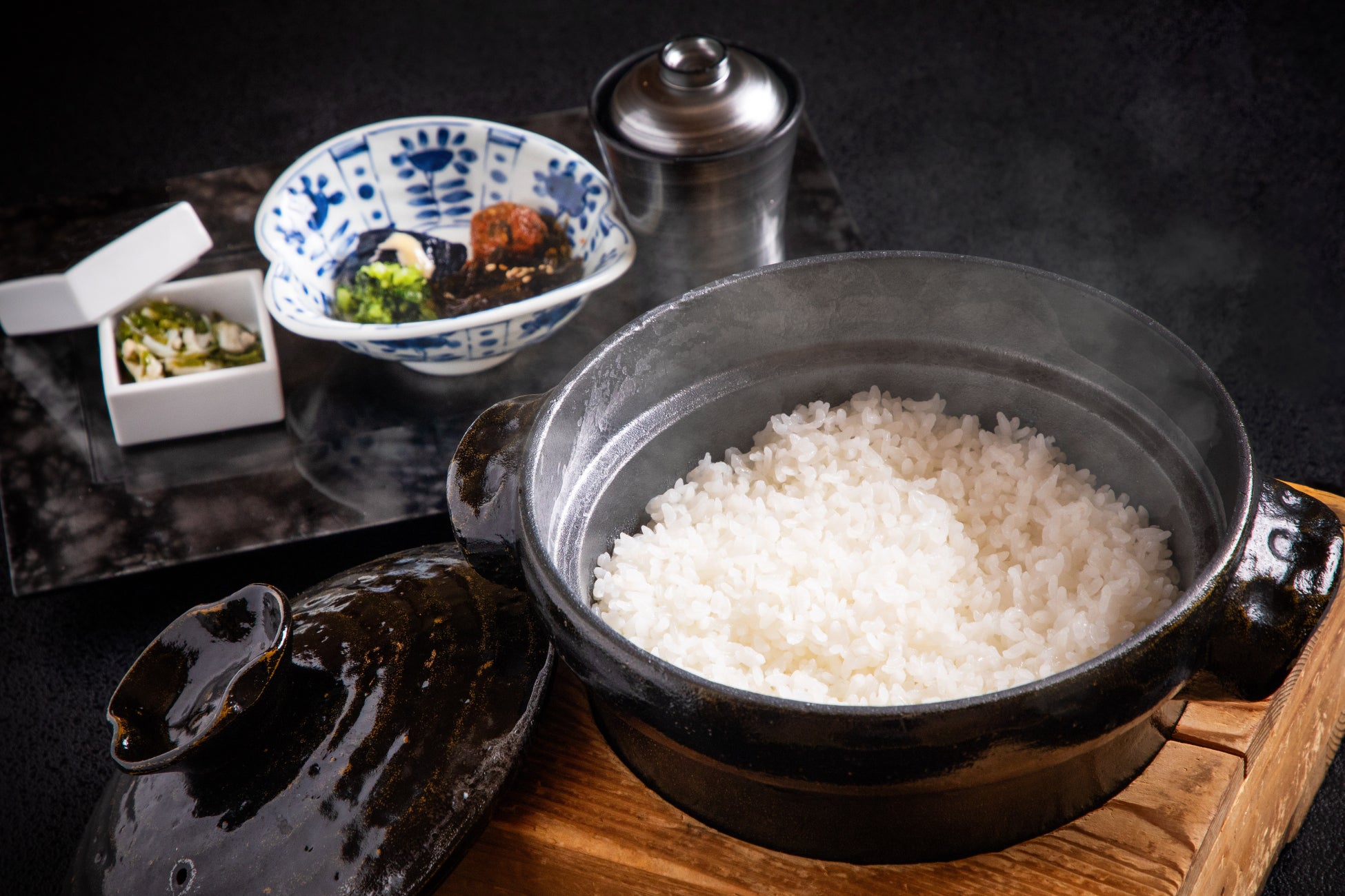 当館で提供しているお米は、「ふっくりんこ」。日本穀物検定協会が実施する「米の食味ランキング」では、令和に入って3年連続で特A評価を獲得しています。その中でも生産に厳しい基準を設けて栽培を行う生産者組織「ふっくりんこ蔵部」のお米を使用しております。その名のとおりふっくらとしたやわらかさが特徴の南北海道生まれのプレミアム米です。お食事のペースに合わせて釜で炊き上げた「ふっくりんこ」をお召し上がりください。ふくよかな香りと白く艶やかな釜炊きごはんに、思わず食が進みます。