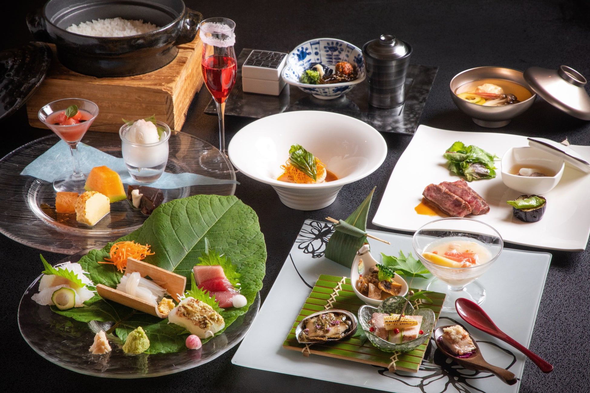 お食事は函館の異国情緒を楽しめるスタイリッシュな和モダン会席をコンセプトに「温故知新」をテーマとし、函館近郊と北海道の食材をモチーフに表現したコース料理をご用意いたしました。提供期間は2024年6月1日(土)~2024年8月31日(土)でございます。