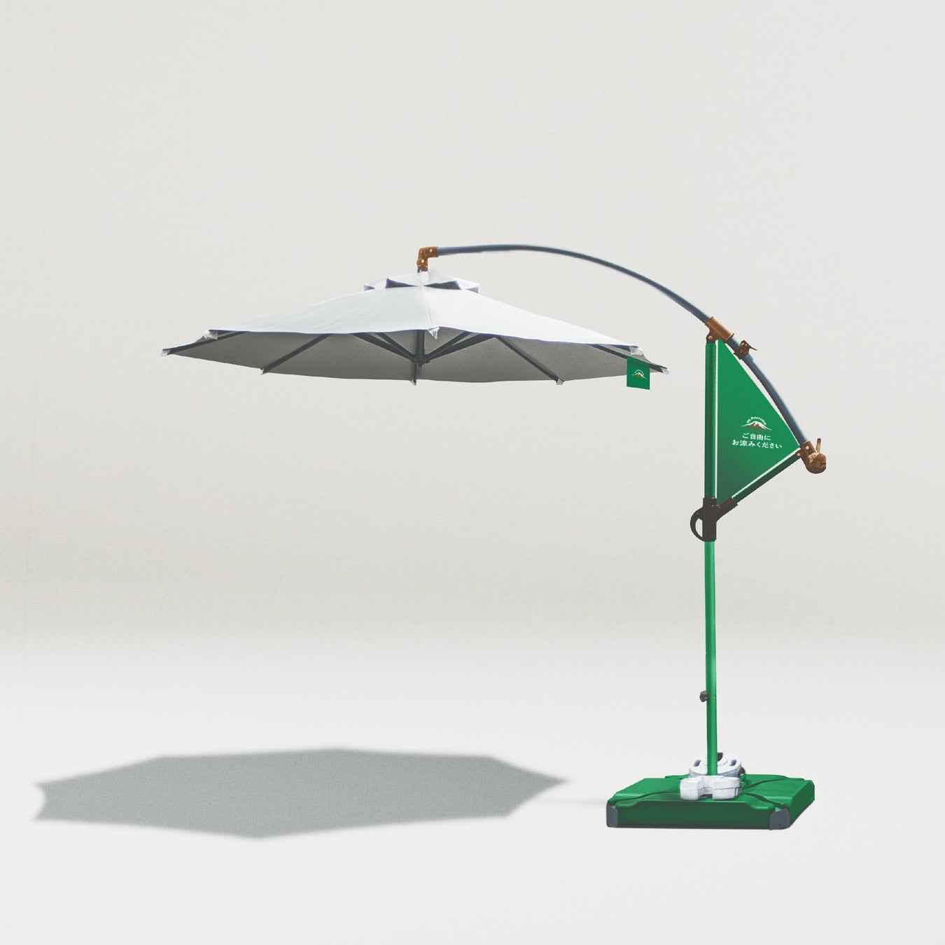 一度に5人ほどが涼める大きな日傘です。太陽光と大気からの熱をブロックし、熱吸収を抑えながら大気圏外(宇宙)に向けて“放射”を行うことで熱を捨て、ゼロエネルギーで外気より低温にするという、人だけでなく地球環境にもやさしい先進的な新素材「SPACECOOL®」を採用しています。
