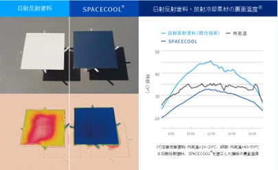 2017年に大阪ガスが行った実証実験では、真夏炎天下環境で直射日光が当たった状態の「SPACECOOL®」の裏面は外気温より最大約6℃も低くなったことが記録されており、温暖化やエネルギーの枯渇問題など、地球規模の大きな課題を解決する世界最高レベルの技術のひとつとして期待されています。