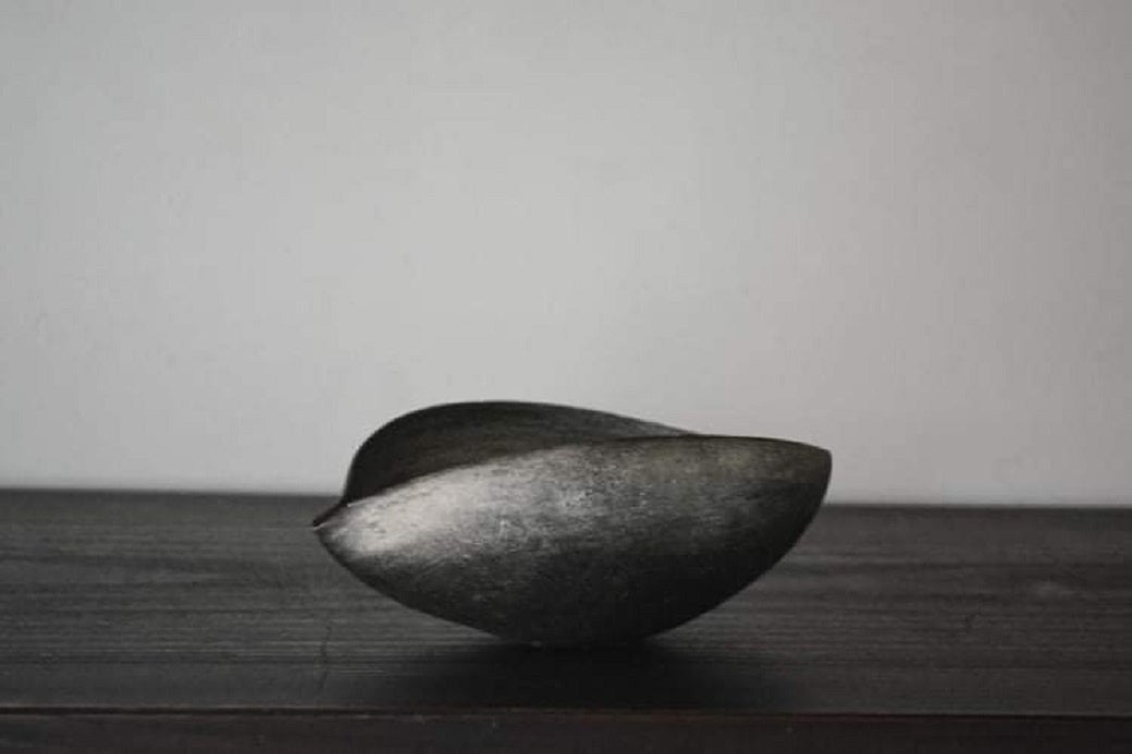 シンプルで美しく、繊細なフォルム、そして陶器とは思えないような錫の質感が印象的な作品です。焼締の器体に漆を塗り、錫の微粉末を蒔き、表面を磨き光沢を出しています。こちらの「錫彩」は、小野澤氏独特の技法です。