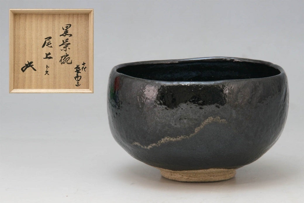 十代 大樋長左衛門は、2011年文化勲章を受章している現代の名工です。2016年に十一代が長左衛門を襲名。十代は現在、大樋陶冶斎(おおひとうやさい)を名乗られております。格の高い黒茶碗に幕釉がとても美しく彩れています。当代裏千家家元の箱書付です。