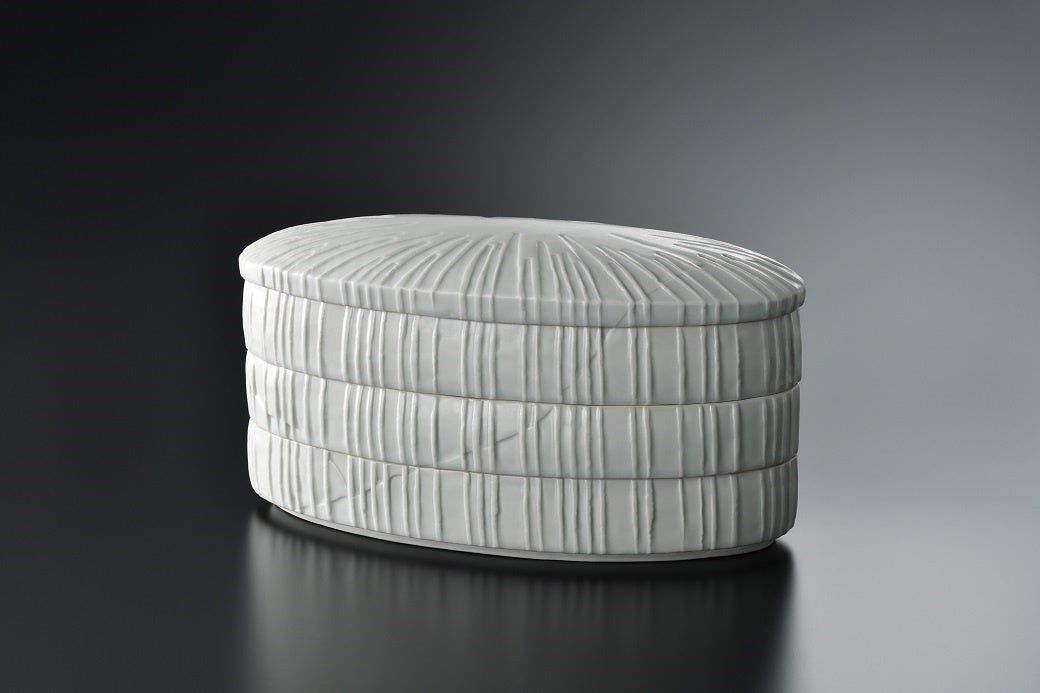 重厚な造りの磁器の三段重です。変化のある縞文様が施され、森氏らしい温かみのある作風となっています。
