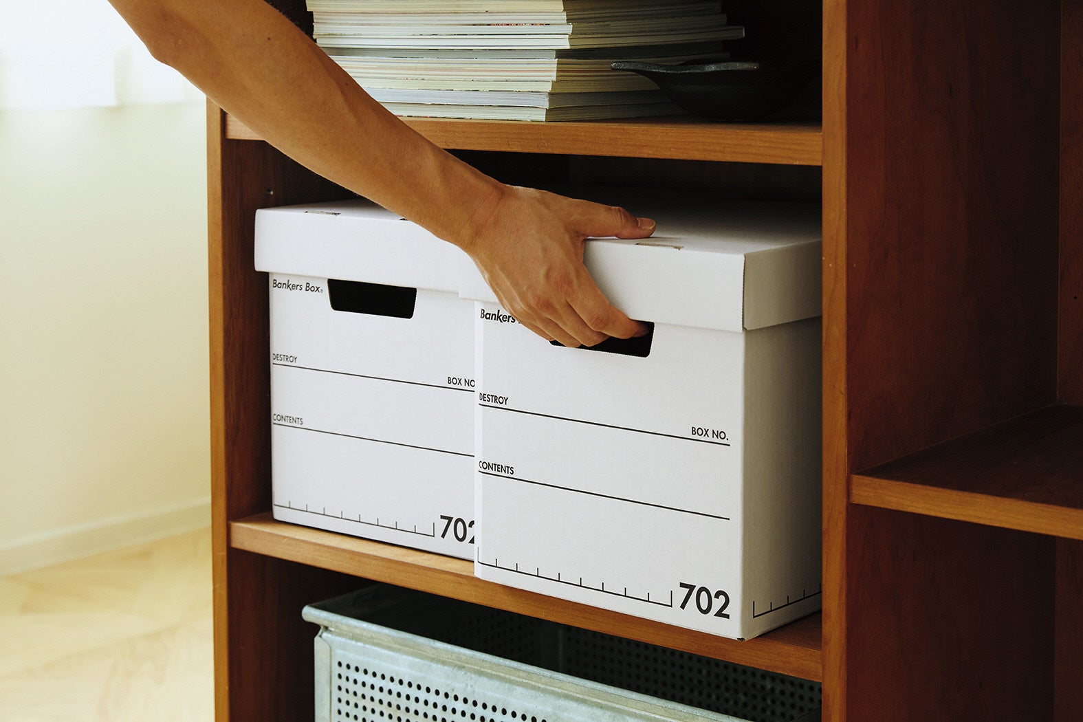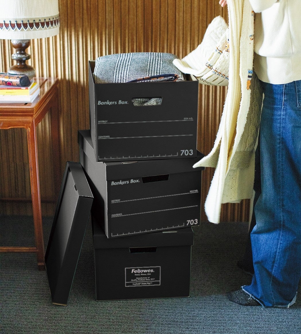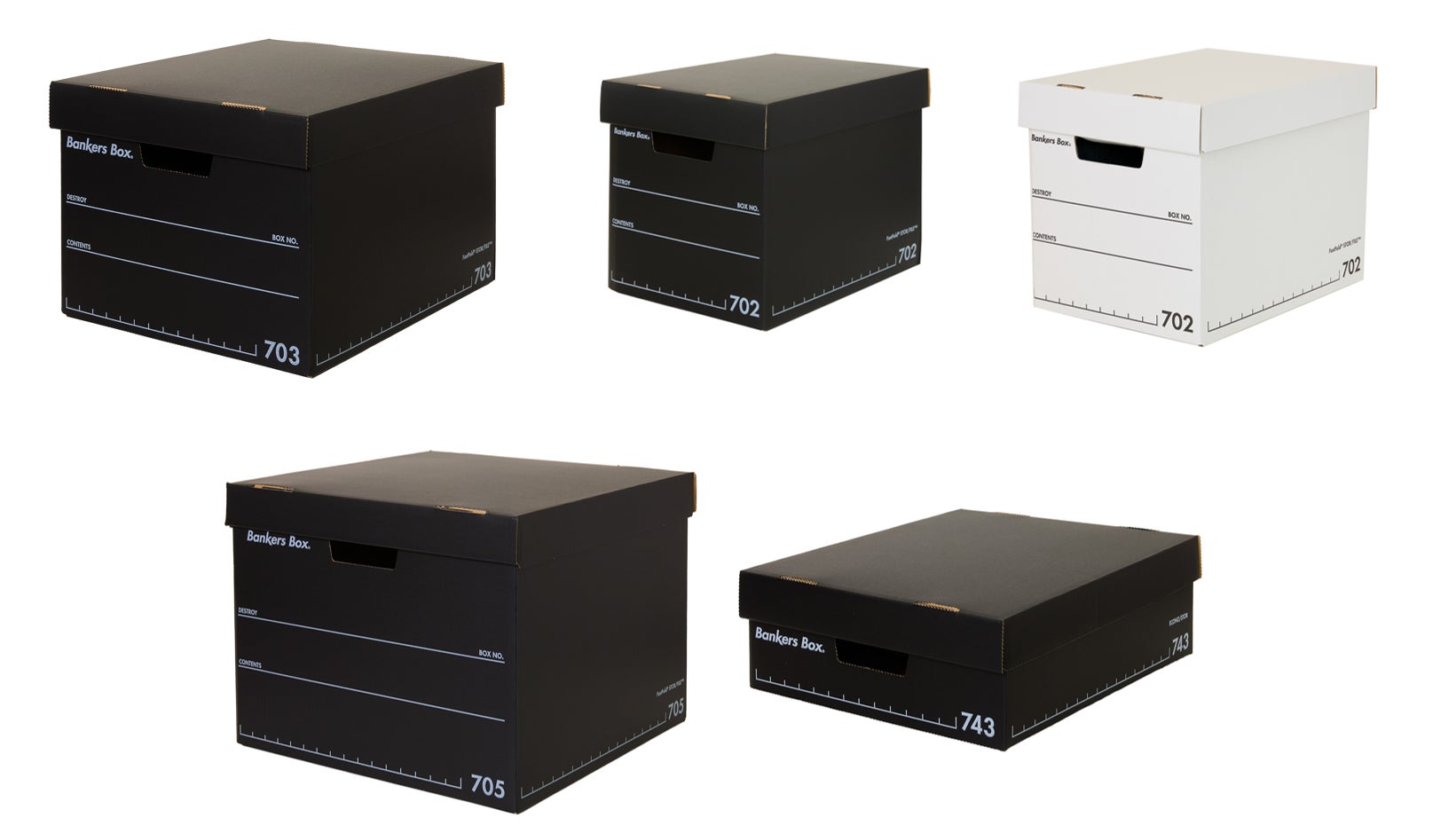 今回発売されるモデルは703sボックス、705ボックス、743sボックス、702ボックスの4種類です。703sボックスはとじ厚50mmのA4ファイルが5冊収納できる大きさで、定番のモデルとなっています。705ボックスはB4ファイルを収容することを想定した、バンカーズボックスシリーズで最も大きいモデルです。743sボックスは定番の703sボックスの高さが半分になったモデルで、家具の上やクローゼットのデッドスペースなど、狭い収納場所を有効活用することができます。702ボックスは今回初めて発売されるモデルで、703sボックスと比べてひとまわり小さいサイズです。こちらはホワイトカラーとフルブラックの2色発売いたします。