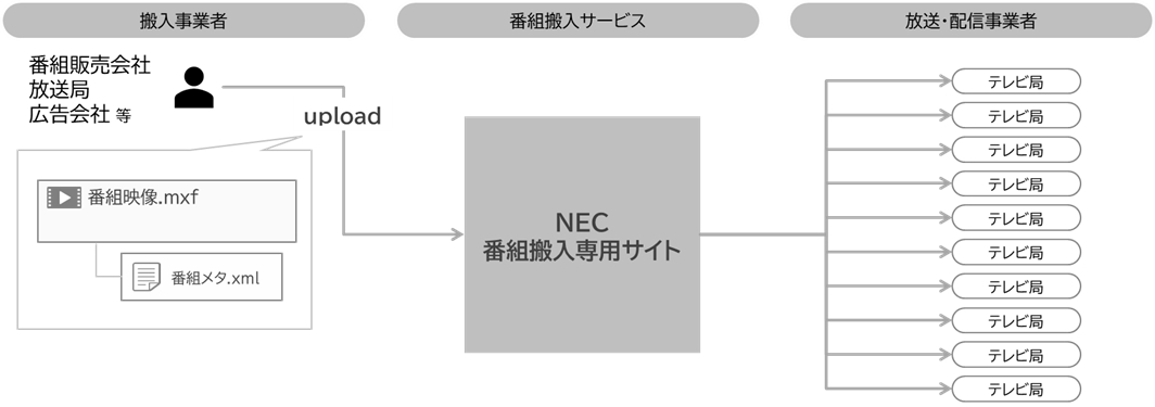 注:これまで各放送局が独自システムを用いて自社系列内でオンライン搬入を行うことはありましたが、WEB上のシステムを使って放送系列をまたいで番組搬入できるサービスは、本サービスが初めてです(NEC調べ)。
