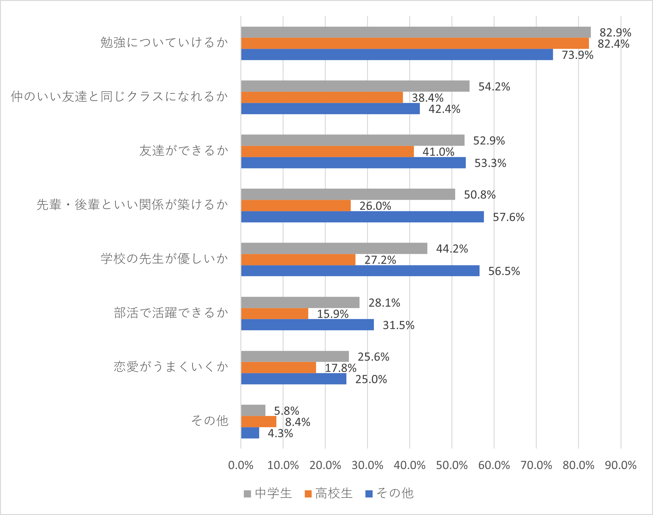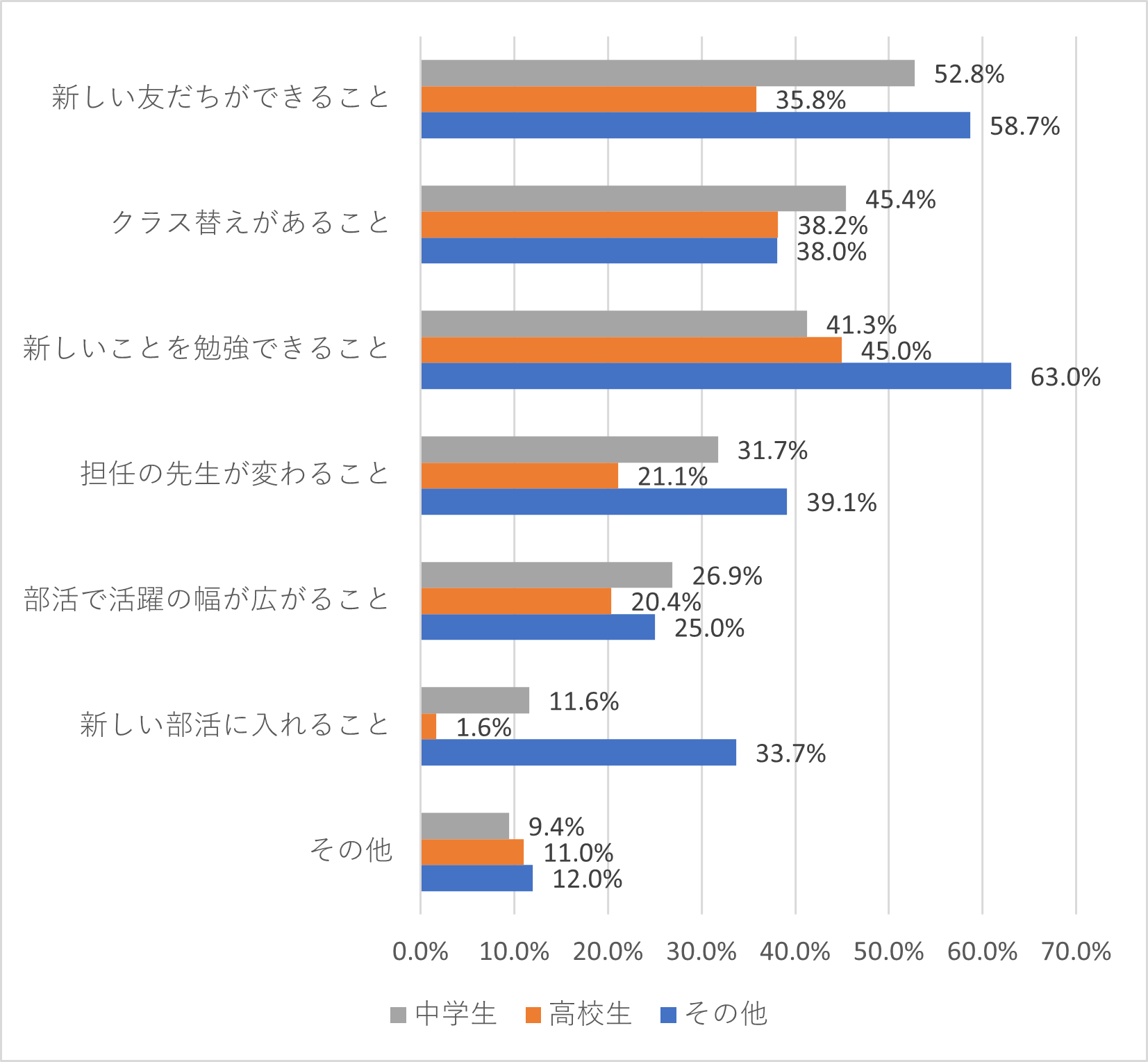 ・新しい友達、クラス替え、新しい勉強などに期待する一方で、「勉強についていけるか」「仲のいい友達と同じクラスになれるか」「友達ができるか」といった不安が多く見られる。