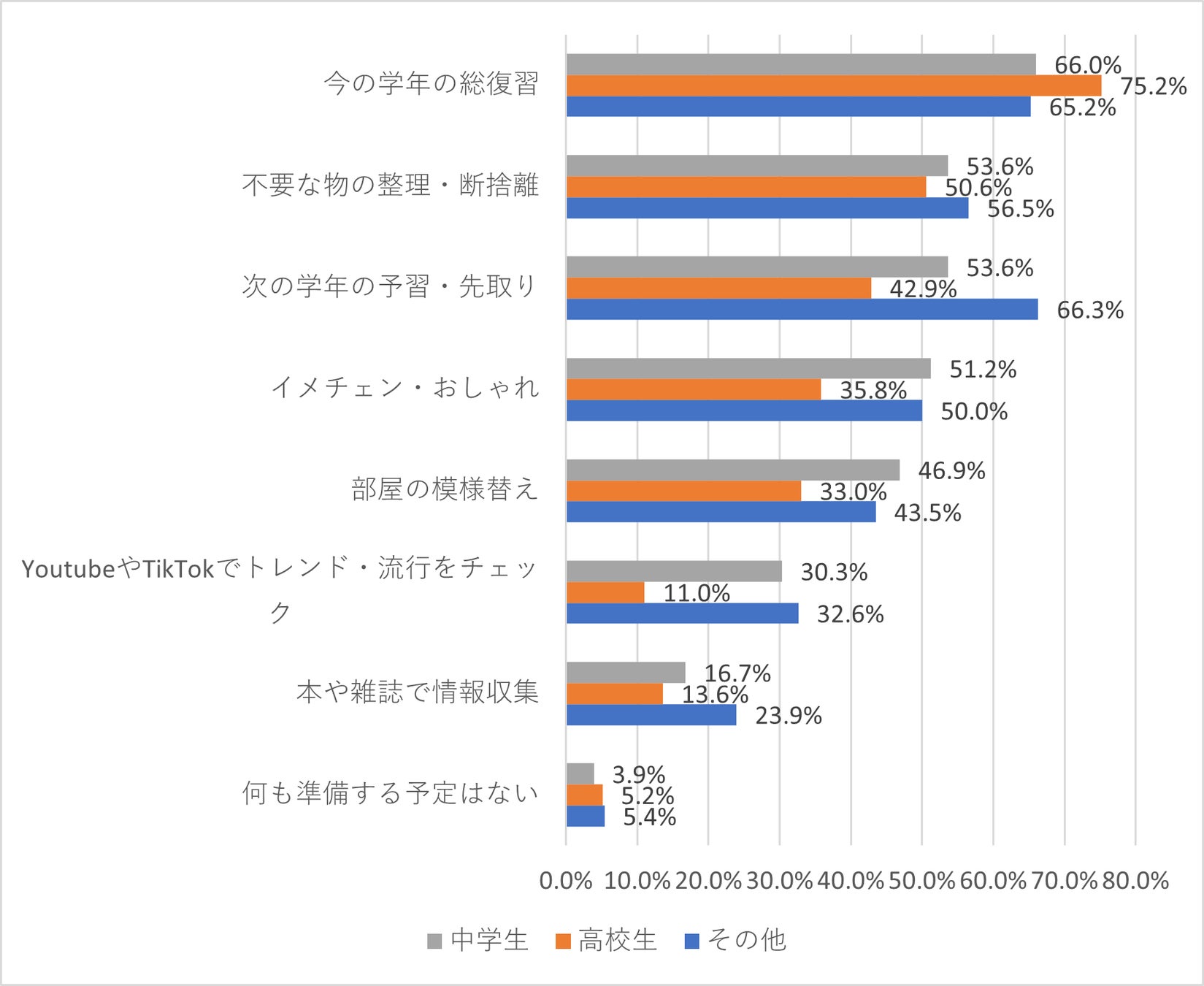 3.新学期に向けて復習や予習などの勉強面と、不用品の整理やイメチェンなどの生活面の両面で準備を進めていこうとしている様子がうかがえる。