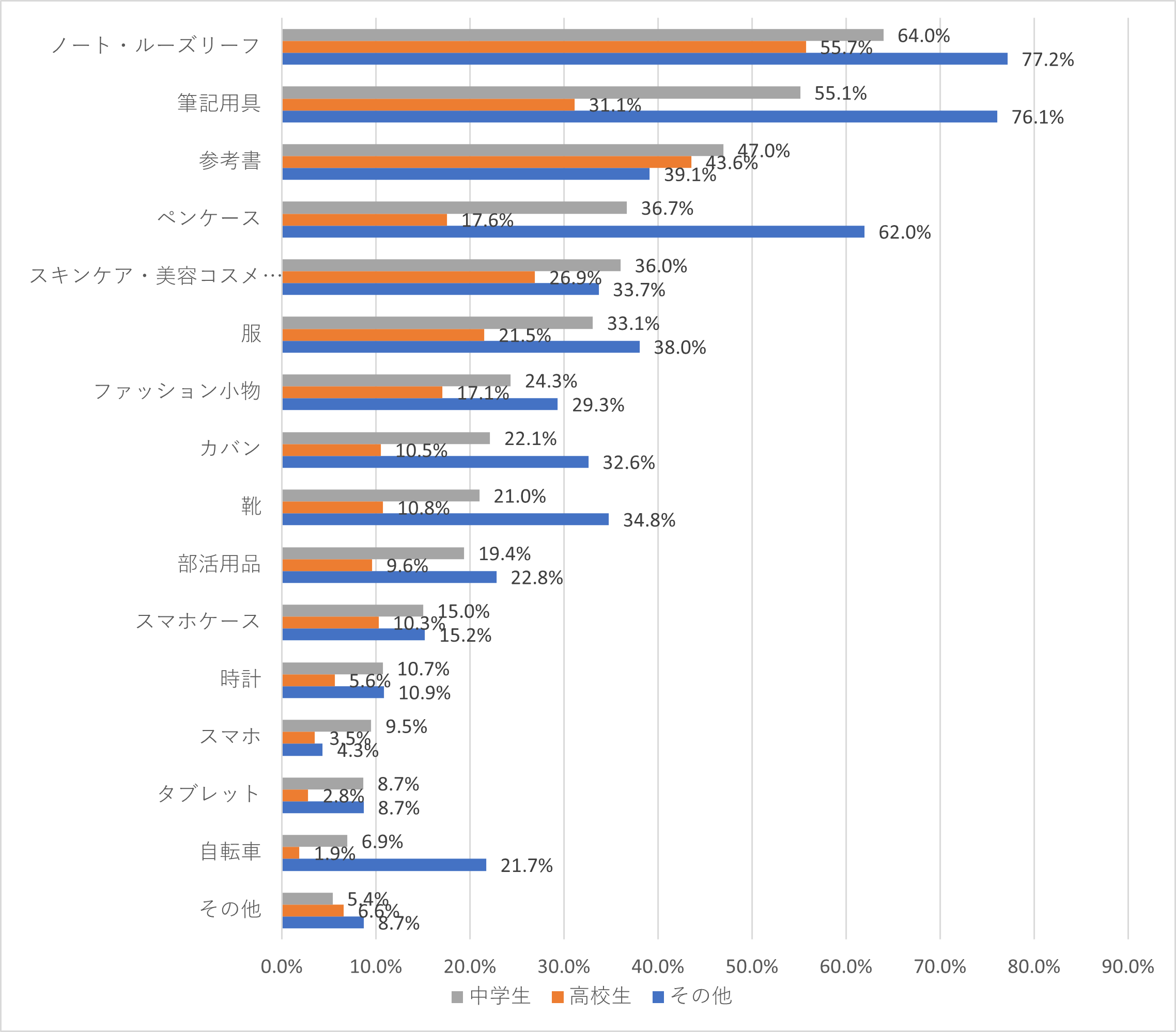 ・中高生ともに、ルーズリーフ、筆記用具、ペンケースなどの文具や参考書といった勉強に関するものが多い。勉強以外だとスキンケア・服・小物などファッションに関するものが目立つ。