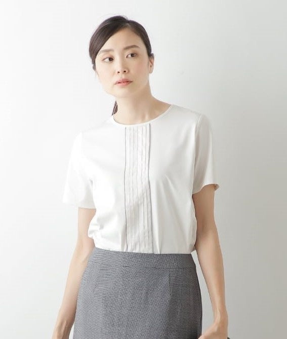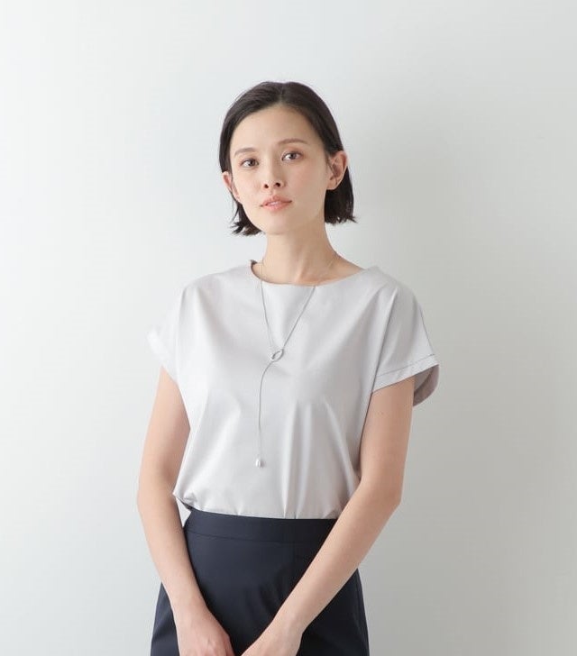 異素材の切り替えと繊細な配色ステッチがポイントの半袖プルオーバー。吸水速乾性を備えた快適な着心地を叶えつつ、ブラウス風のクリーンなルックスで品よく決まるアイテムです。シンプルながら1枚でも映えるきちんと感があり、単品使いからジャケットインまで幅広く活躍します。