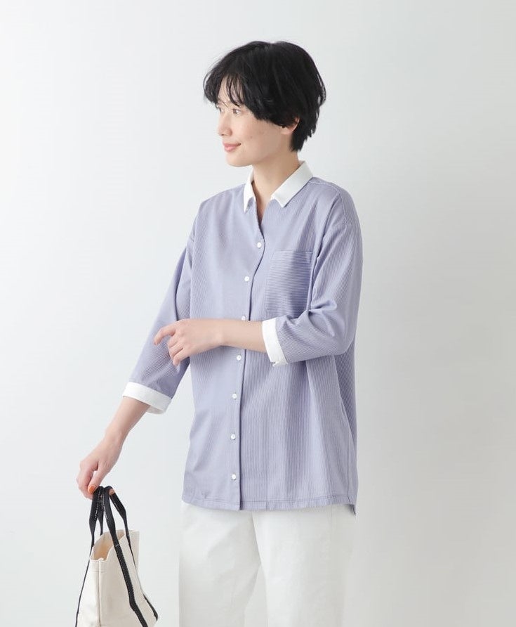 接触冷感性のあるカットソー素材で仕立てた、カジュアルに着回せるクレリックシャツ。襟先にはスナップ釦を配し、襟の形を美しくキープします。ストライプの柄と白の配色が爽やかな印象で、夏の着こなしに映えるアイテムです。程よくリラックス感のある、ゆったりとしたシルエットもポイント。