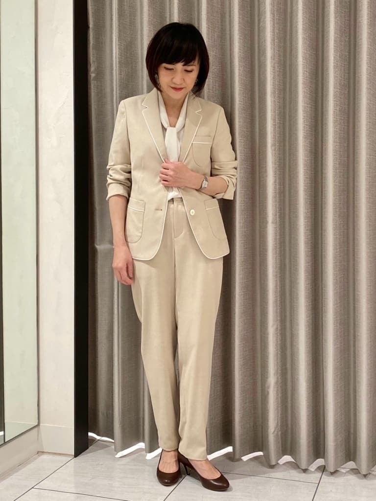 麻混のセットアップで、堅くなりすぎないナチュラルなムードに。ジャケットのコードパイピングや貝釦のホワイトが、ブラウスの色とマッチして爽やかな印象を与えてくれます。また、フロントに覗くボウタイがさりげなく上品さをプラスします。