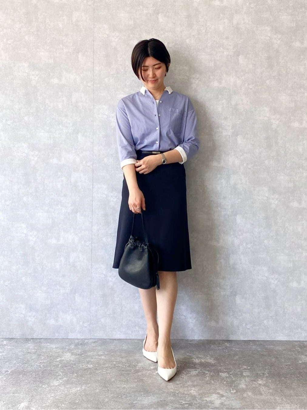 着丈長めのシャツの裾をスカートにインしてすっきりとしたシルエットに。クレリックカラーと合わせたホワイトのインナーを覗かせることで、抜け感のある爽やかな着こなしに仕上げました。スカートはセミフレアデザインで、広がりすぎない上品なラインが魅力です。