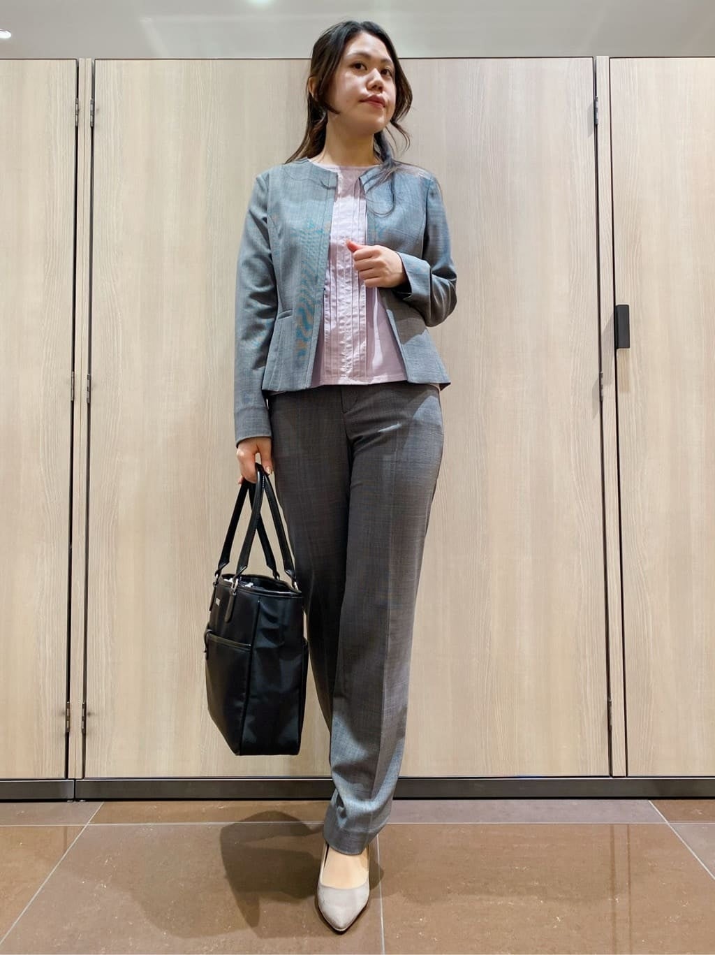 クールなパンツスタイルには、ラベンダーのインナーを差し色にして柔らかい印象をプラス。コンパクトな着丈で、裾をインせずに着用してもバランス良くまとまります。スーツは2色の糸を使用したニュアンスのある織り柄で、明るく軽やかな見え感が魅力です。