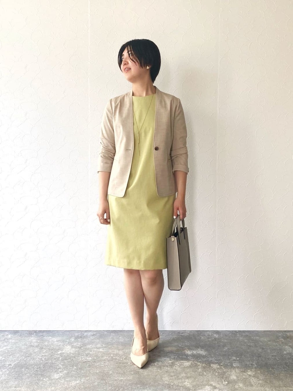 ジャケットのドライなタッチにマッチする麻混のワンピースを合わせて爽やかに。ベージュ×イエローグリーンの優しい色合いが、顔映りを明るく演出します。華奢なチェーンのロングネックレスをプラスすれば、ジャケットのVカラーと相まって更にシャープな印象に。