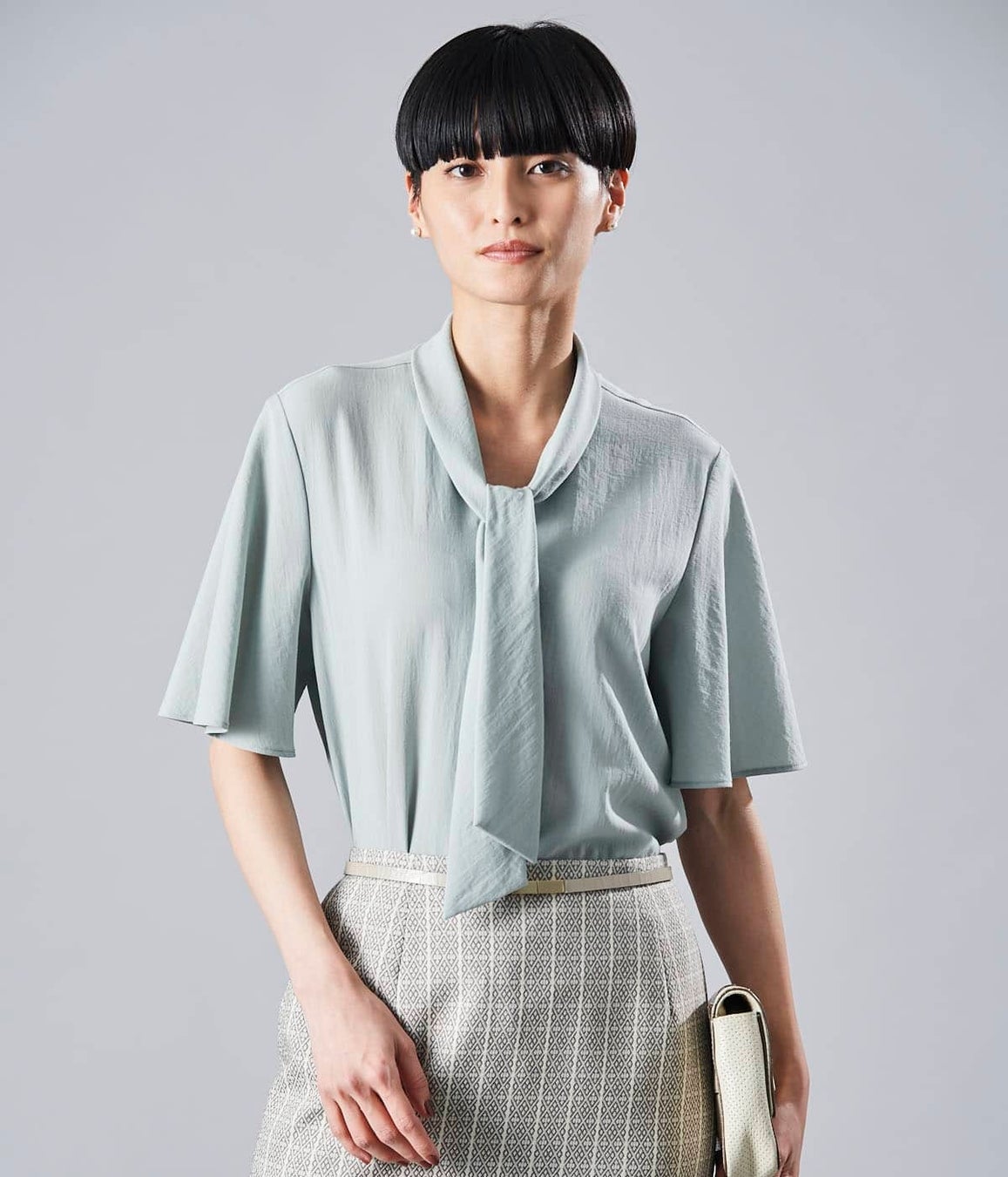 気になる二の腕を自然にカバーしてくれる、フレアタイプの5分袖ブラウス。ふんわりとしたショールカラーから一続きになったボウタイは、太すぎず細すぎないバランスできちんと感のある印象に。吸水速乾性に優れたトリアセテートコットンを使用しており、汗ばむ季節も快適にお召しいただけます。