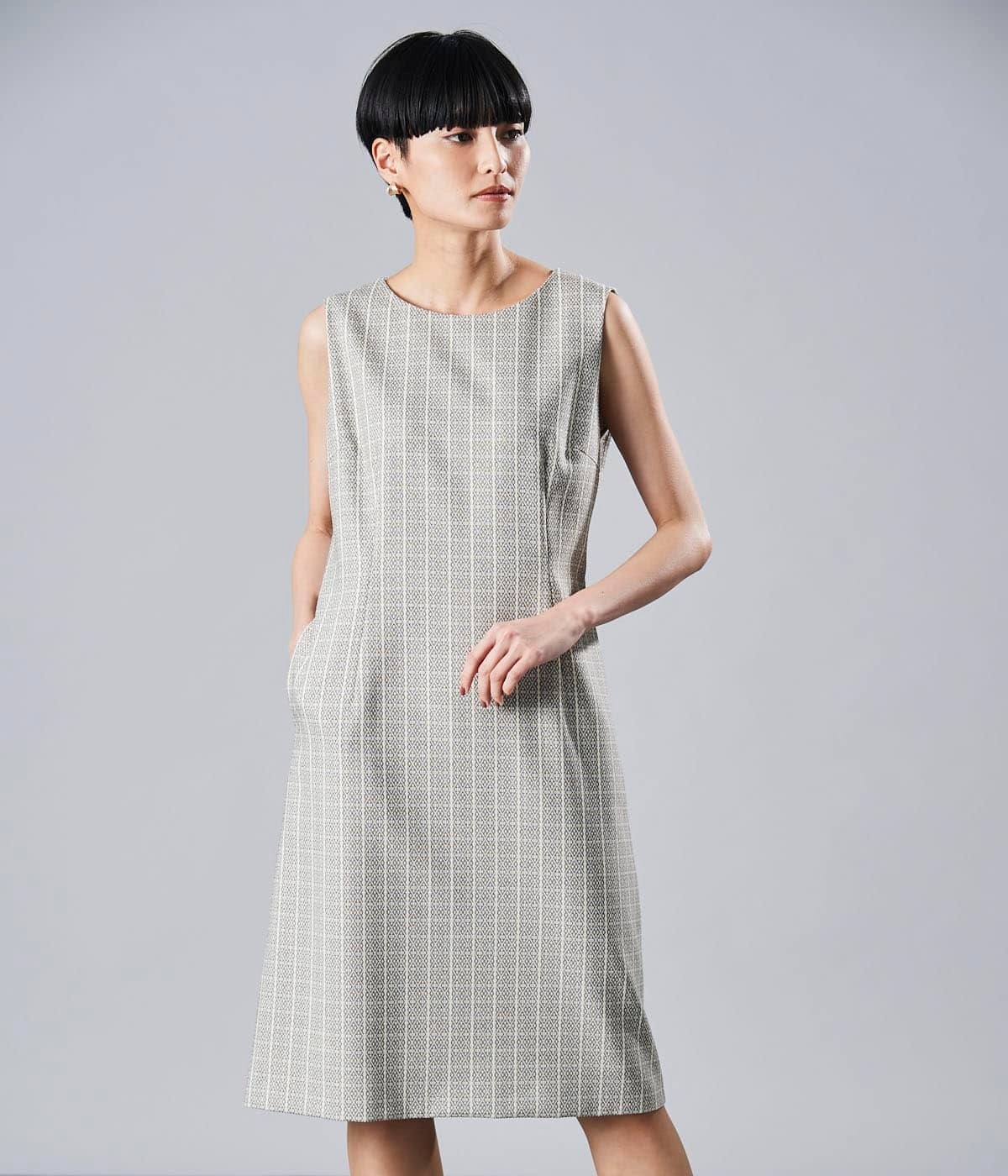 まるでジャカード織りのような、複雑な幾何学模様が目を惹くノースリーブワンピース。1枚着はもちろん、ジャケットを羽織ってビジネススタイルなどにも対応できる上品なアイテムです。ストレスフリーな着心地を叶えるストレッチ性もポイント。緩やかに広がるAラインシルエットは、動くたび揺れる裾が女性らしく優美な印象を与えてくれます。