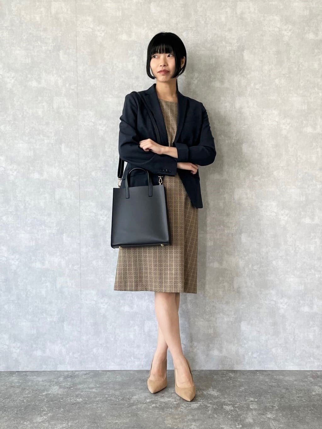 エスニックなムード漂う個性的なブラック×ブラウンには、テーラードジャケットを合わせてスタイリッシュな着こなしに。ダークなトーンのネイビーでまとめたジャケットとバッグが、重たくなりすぎず知的な雰囲気を与えてくれます。