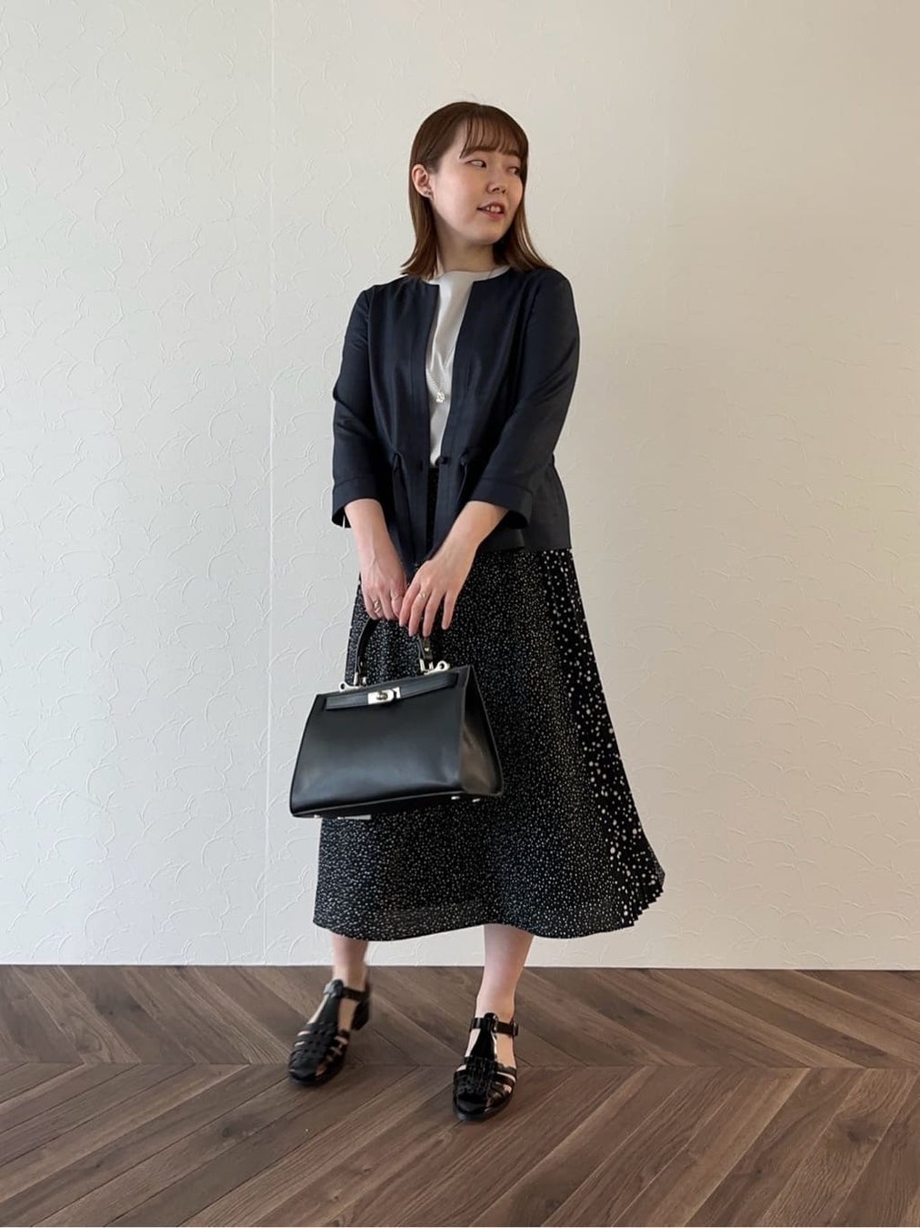 ジャケット風の変形ブラウスを羽織って、エレガントなオフィスカジュアルスタイルに。ネイビーやブラックでシックにまとめつつ、カットソーはライトグレーをチョイスすることで顔映りを明るく演出しました。スカートの繊細なドット柄も、上品さを高めてくれます。