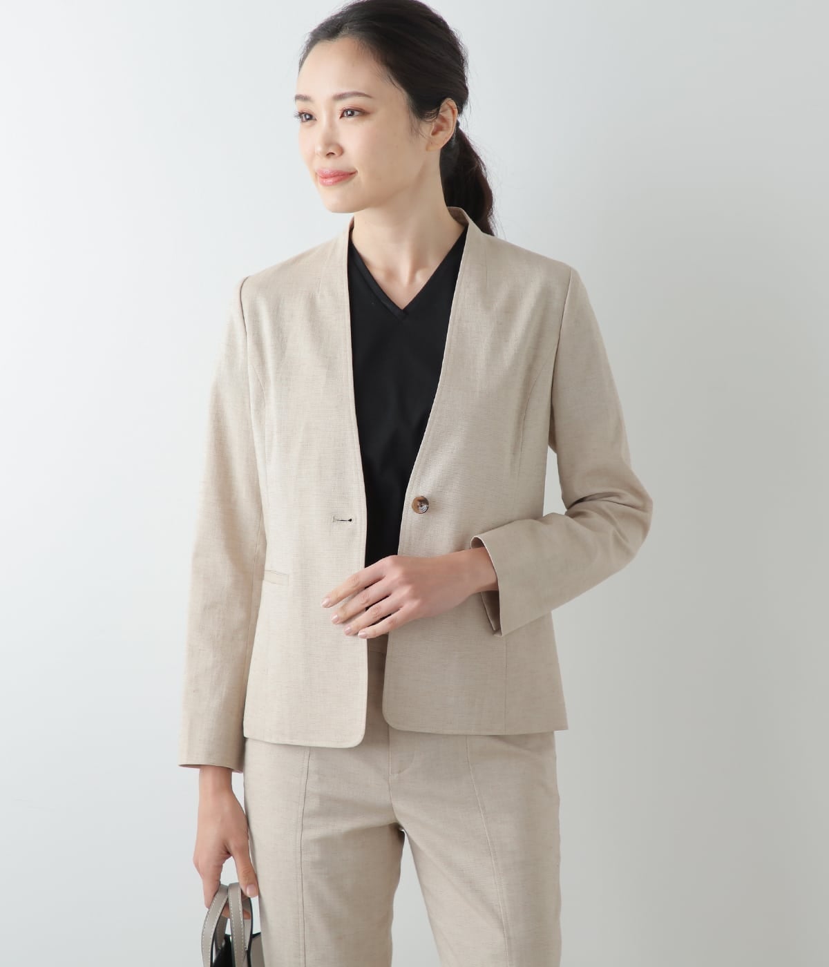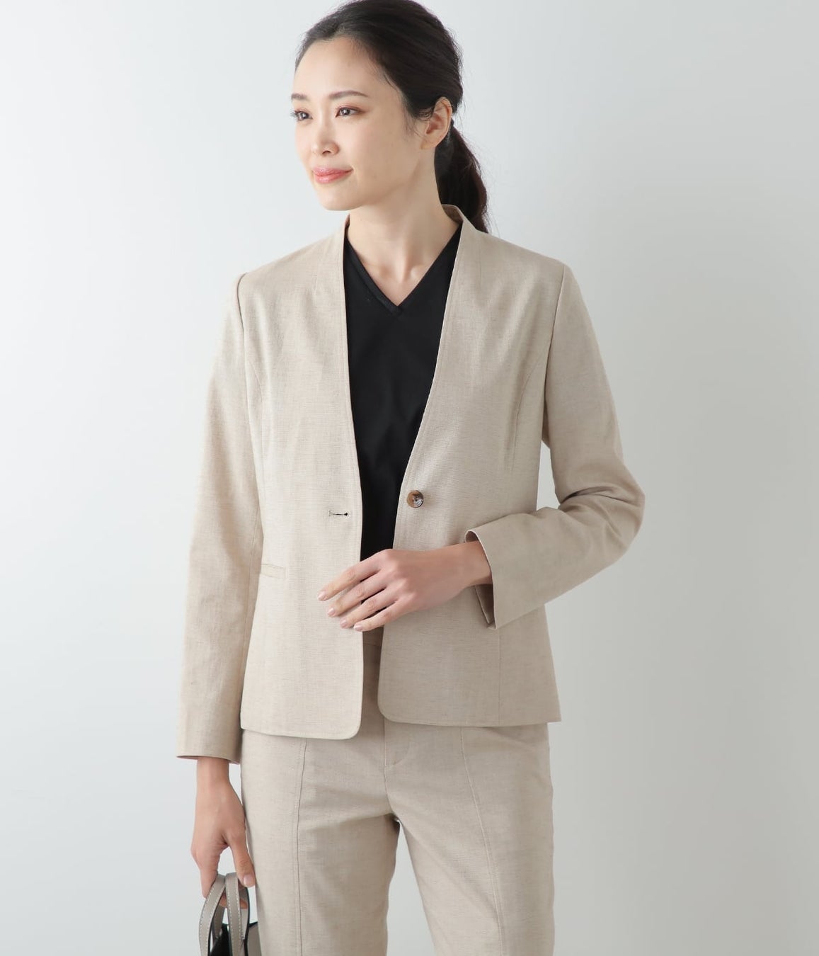 シャンブレーのナチュラルな風合いが優しい表情に導く、セットアップ対応のカラーレスジャケット。着心地快適なストレッチ性を備えたウォッシャブル素材で、働く女性に嬉しい機能もポイントです。後ろの襟切り替えからのVラインが首元をシャープに見せ、スタイリッシュな印象に見せてくれます。
