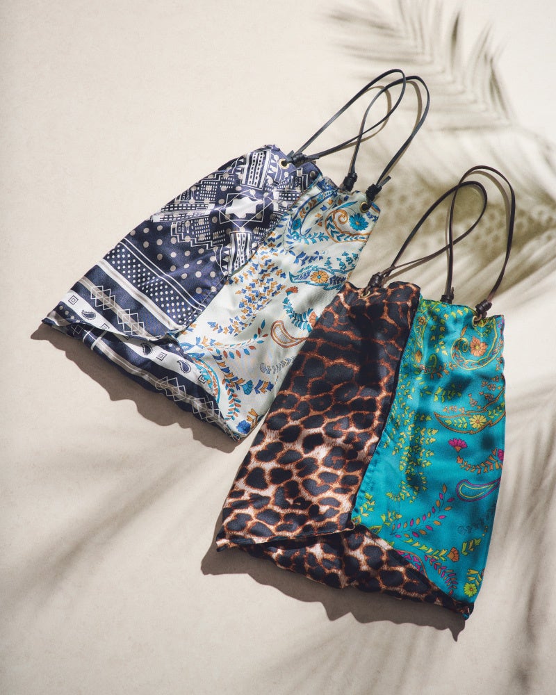 ドット×ペイズリーの爽やかなブルー系でまとめたものと、スパイス的に使えるレオパード×ペイズリーの組み合わせです。裏地はリネン100%のヘリンボーン生地で、がらっと印象の変わるリバーシブル使いが可能です。
