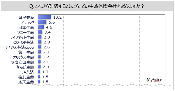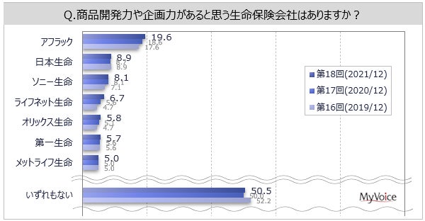 【生命保険会社のイメージに関する調査】商品開発力・企画力があると思う生保は「アフラック」が2割、「日本生命」「ソニー生命」が8~9%、「ライフネット生命」「オリックス生命」「第一生命」が6~7%