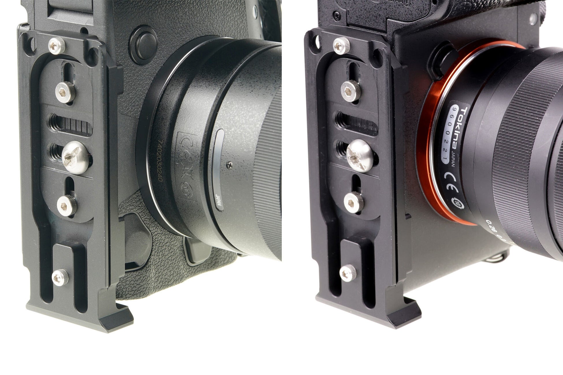 主要なフルサイズミラーレス機にフィットするように、ネジ位置が前後左右に調整可能。カメラ前面の回り止めにより、縦位置時でもカメラが回転しません。