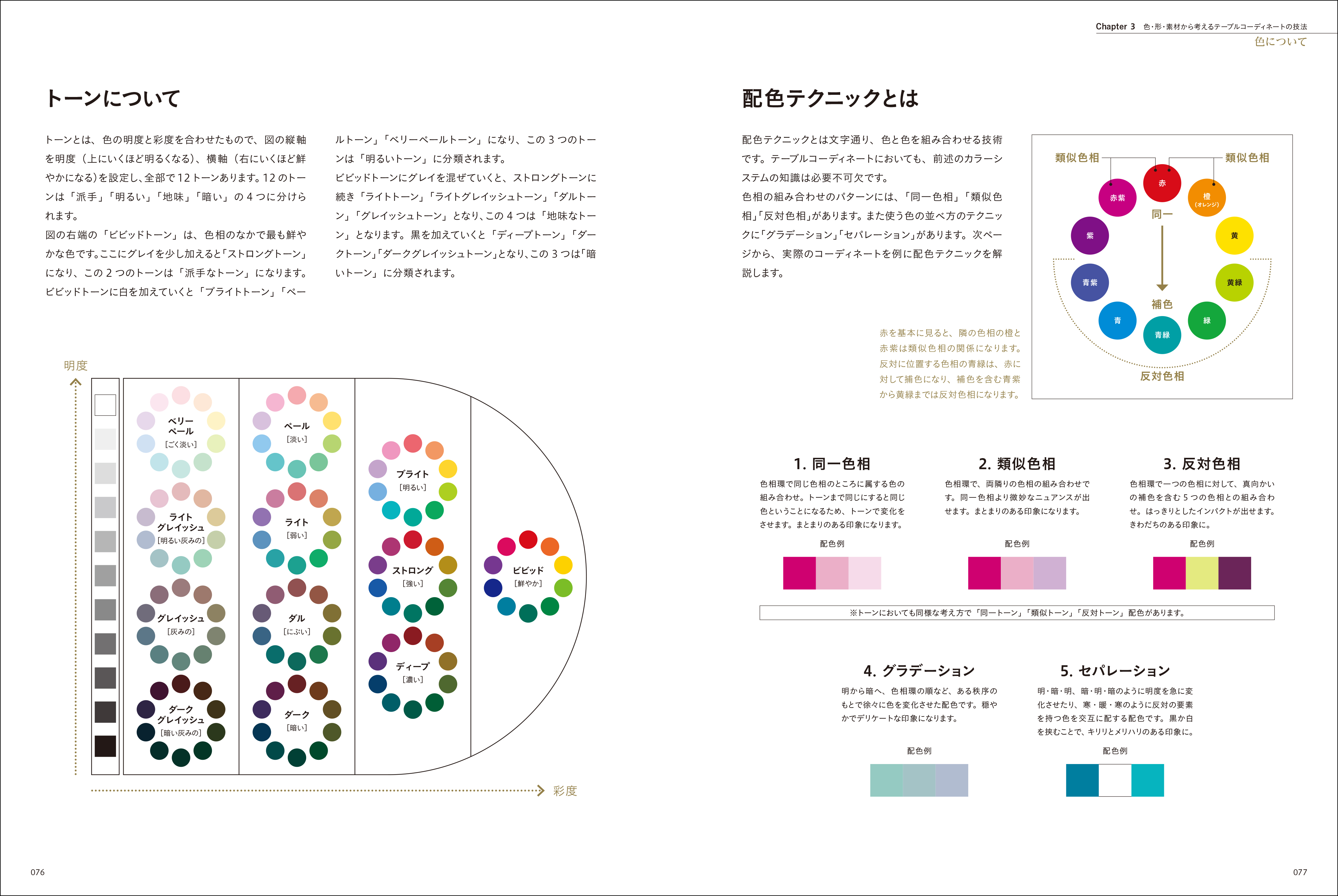カラーシステムとは/色相について/トーンについて/配色テクニックとは/配色テクニック1:同一配色/配色テクニック2:類似色相/配色テクニック3:反対色相/配色テクニック4:グラデーション/配色テクニック5:セパレーション/テーブルクロスの色と柄の効果/色が与える心理的な効果/多色相配色のコーディネート例