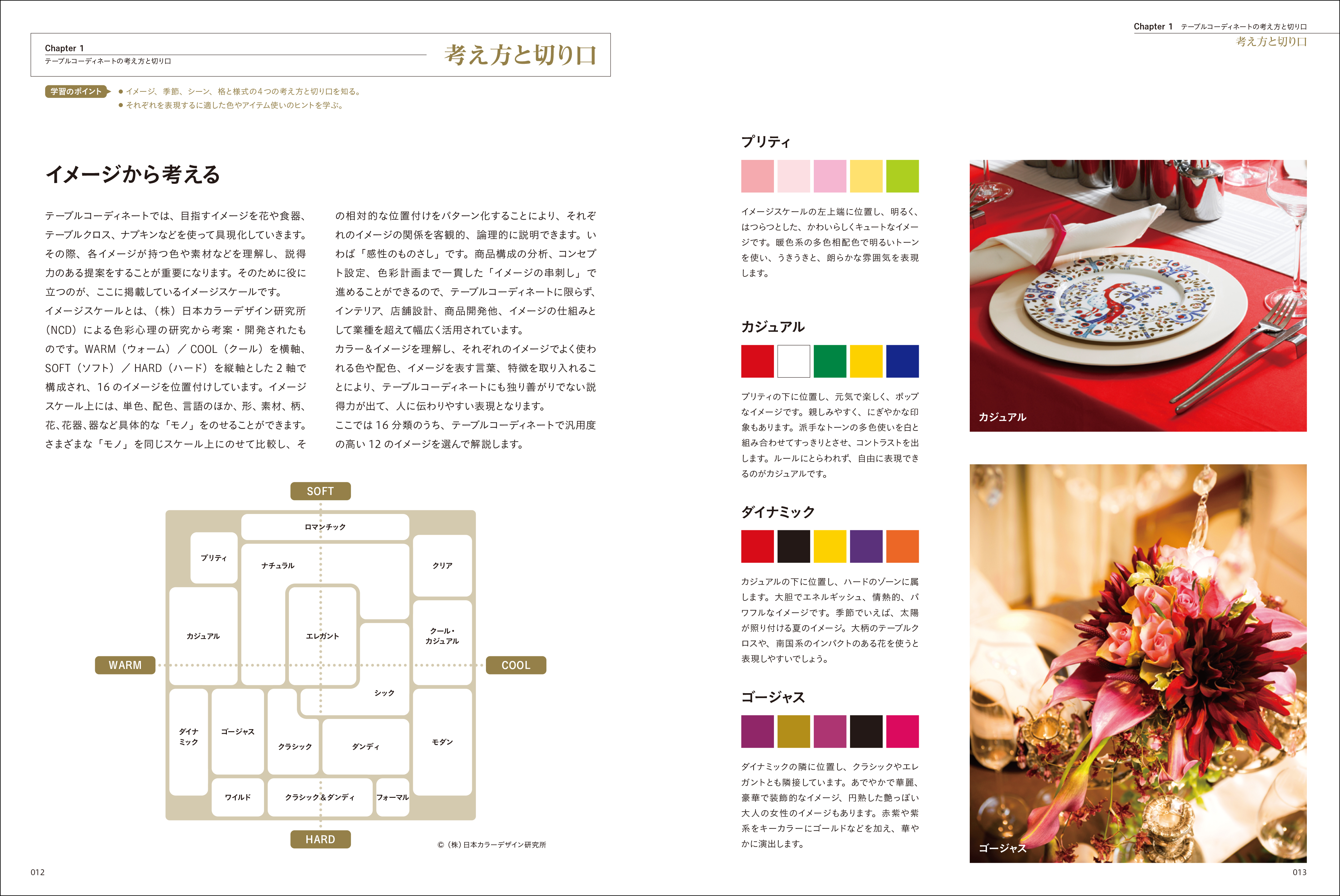 また、コーディネートの基本構成に加えて、皿やナプキンなどのアイテムの種類や色を変えると印象がどのように変化するかなど、テーブルコーディネートの持つ視覚効果についても紹介しています。